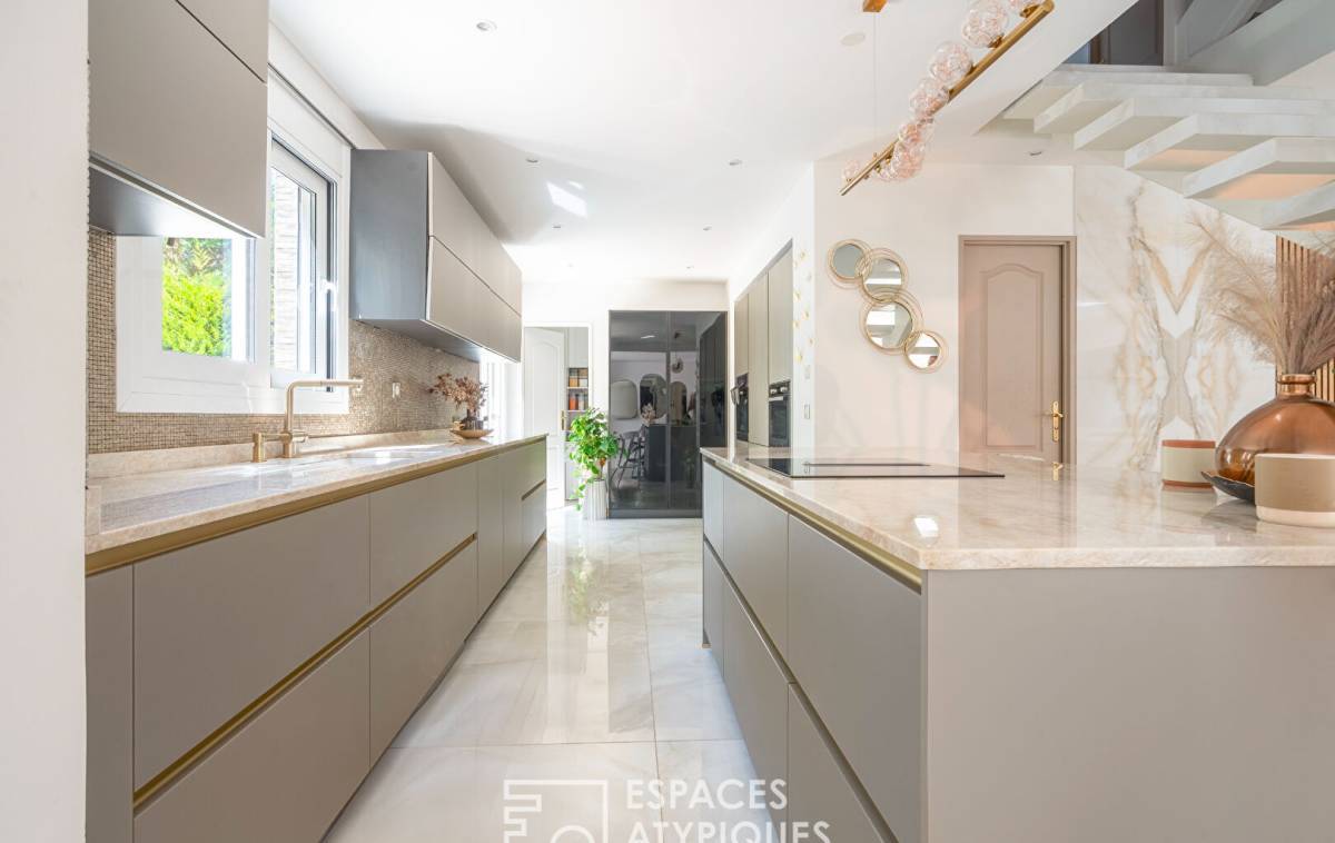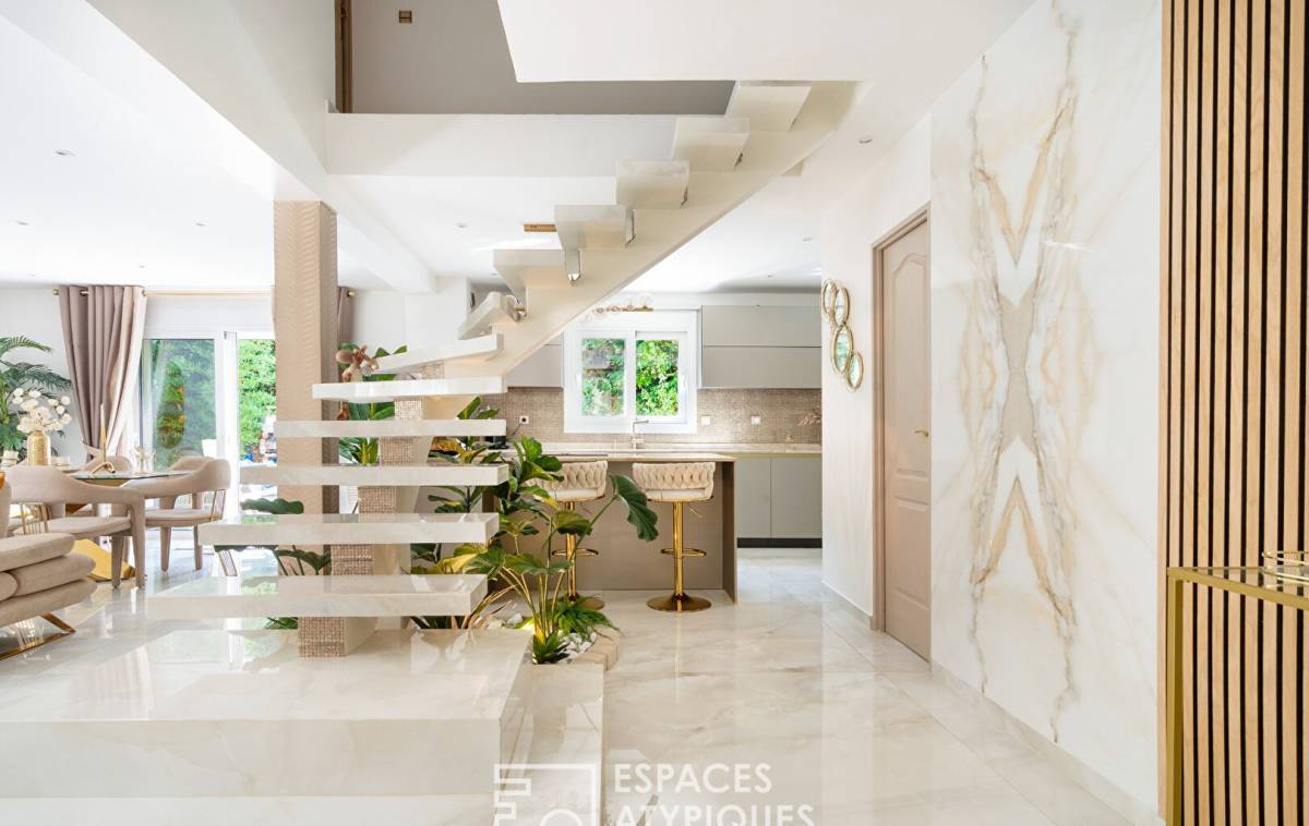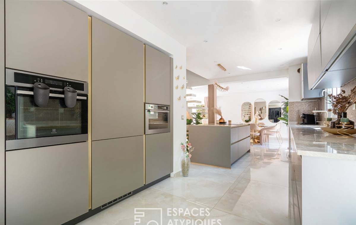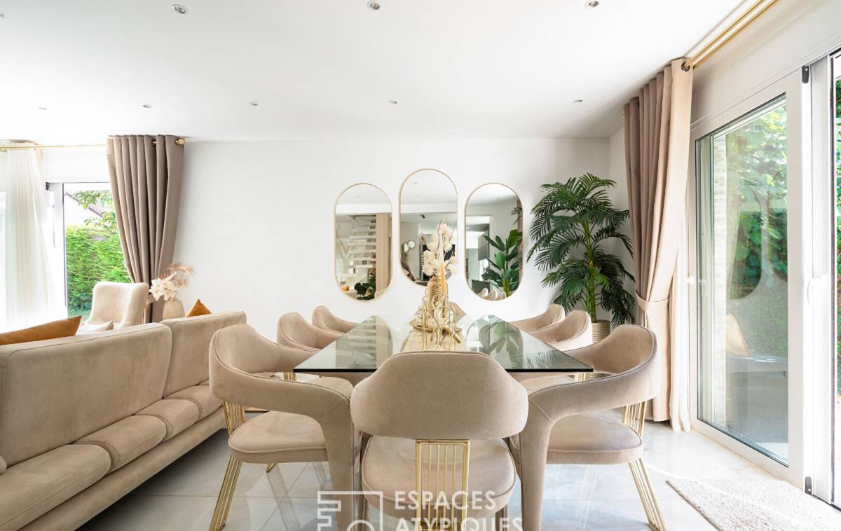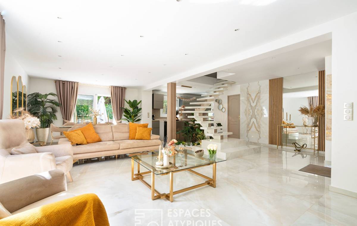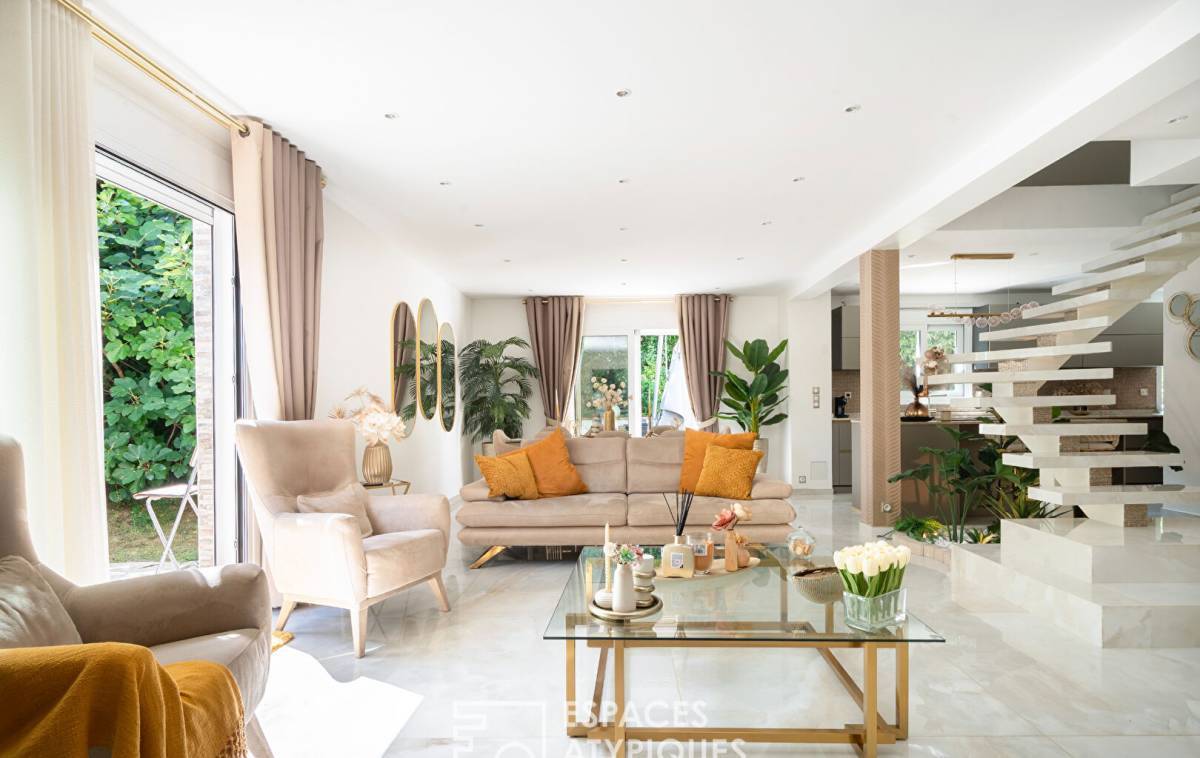 In Thiais, in the sought-after Green Valley development, this 160 m² family home (230 m² floor space), completely redesigned by its owners, offers a refined yet welcoming living experience. Nestled on a 587 m² plot, its understated, elegant lines stand out in a quiet residential area, just a stone's throw from schools and amenities.
