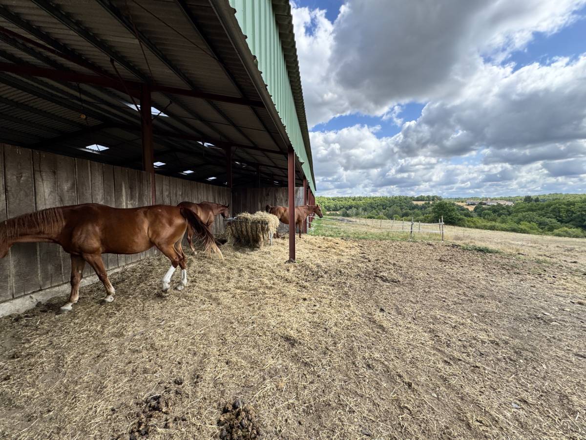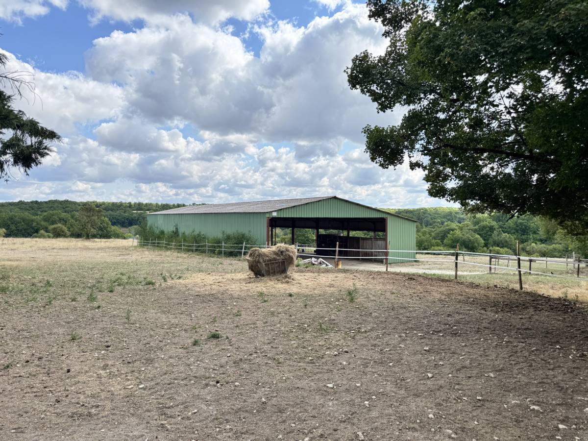 The equestrian estate extends over vast wooded meadows, bordered by a stream and a natural pond. Entirely designed for the comfort of the horses, it features a large agricultural shed, 12 stalls, a lighted riding arena, as well as paddocks equipped with water troughs and shelters.