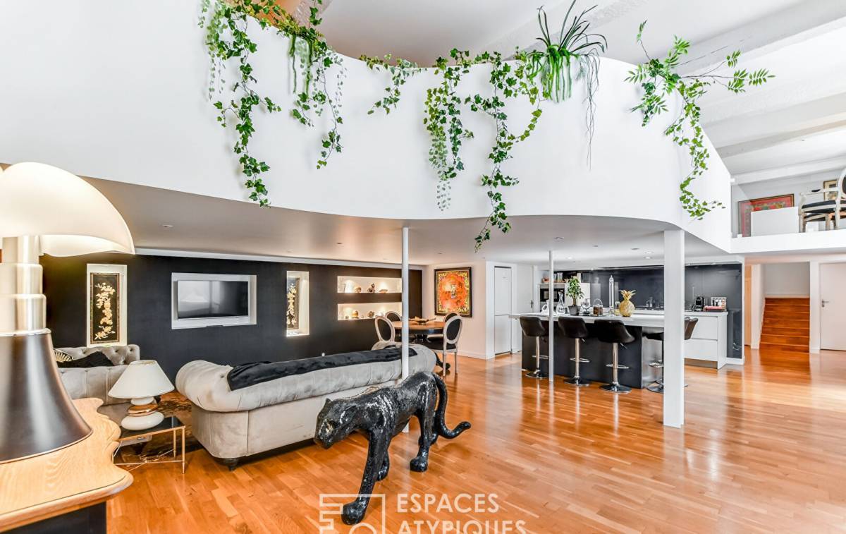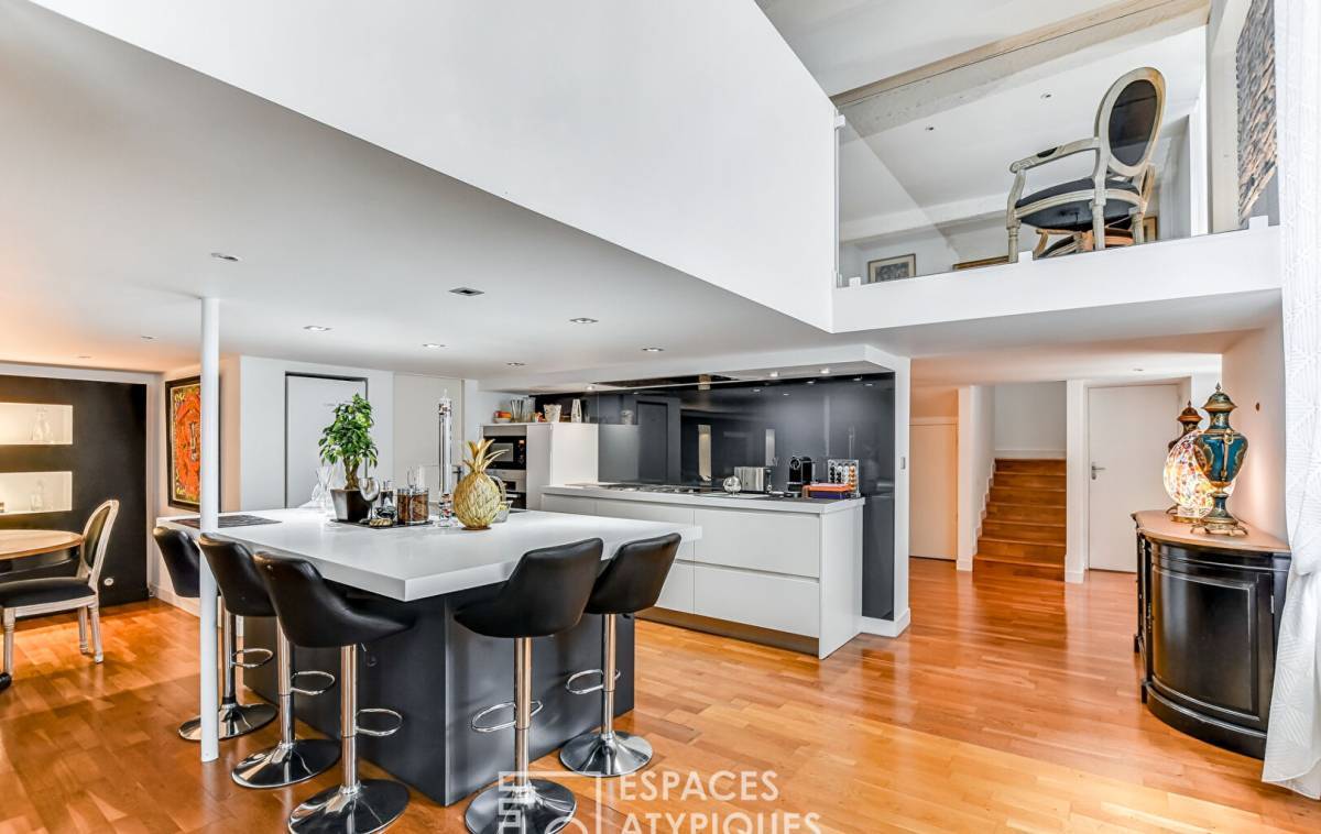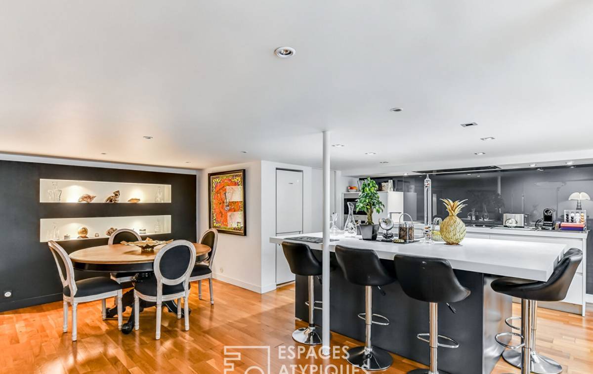 The entrance hall offers a first level of 100 m² with generous and resolutely modern volumes, creating a striking contrast with the classic elegance of the building. The 65 m² living room charms with its unique atmosphere and multiple perspectives. The open-plan kitchen, clad in Corian, invites conviviality and intimate gatherings. Bathed in light thanks to its numerous east-facing windows, the space is reinvented with the changing seasons.