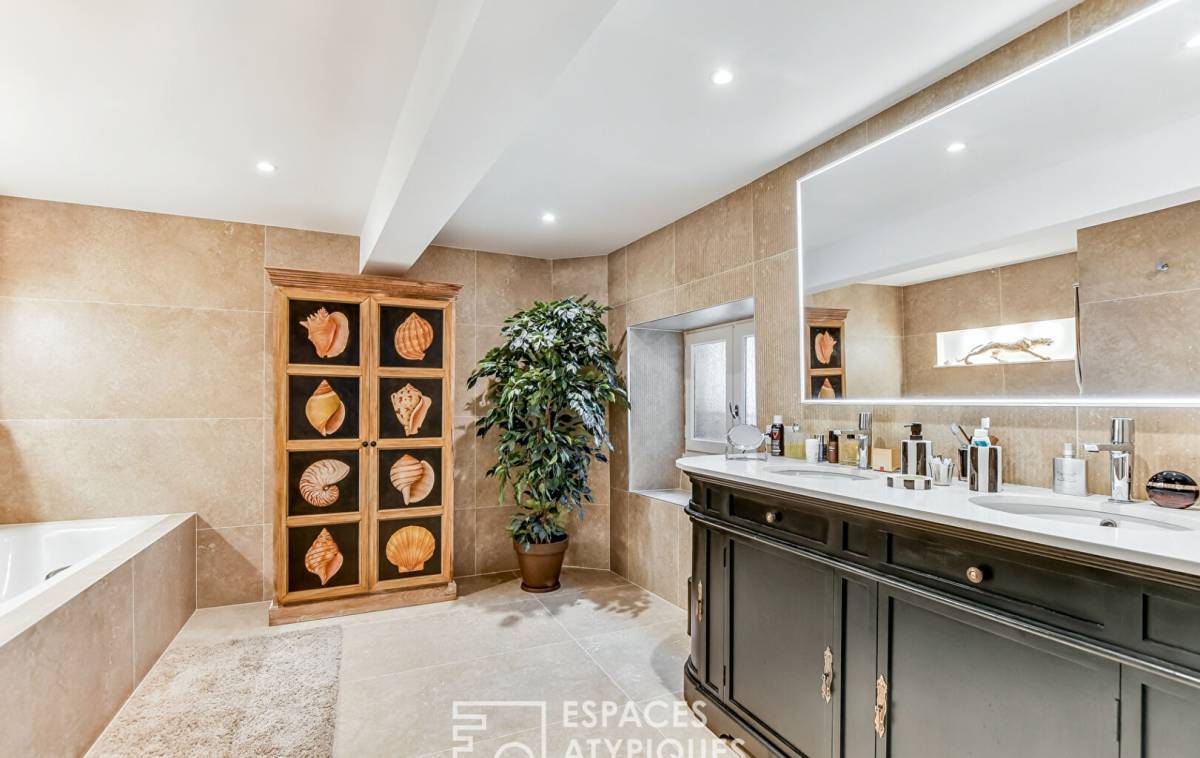 The upper floor, dedicated to rest, features a vast 23 m² suite with a private bathroom. A generous hallway, opening onto the living room, leads to an office that can be converted into a third bedroom as desired.