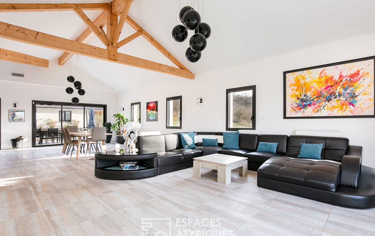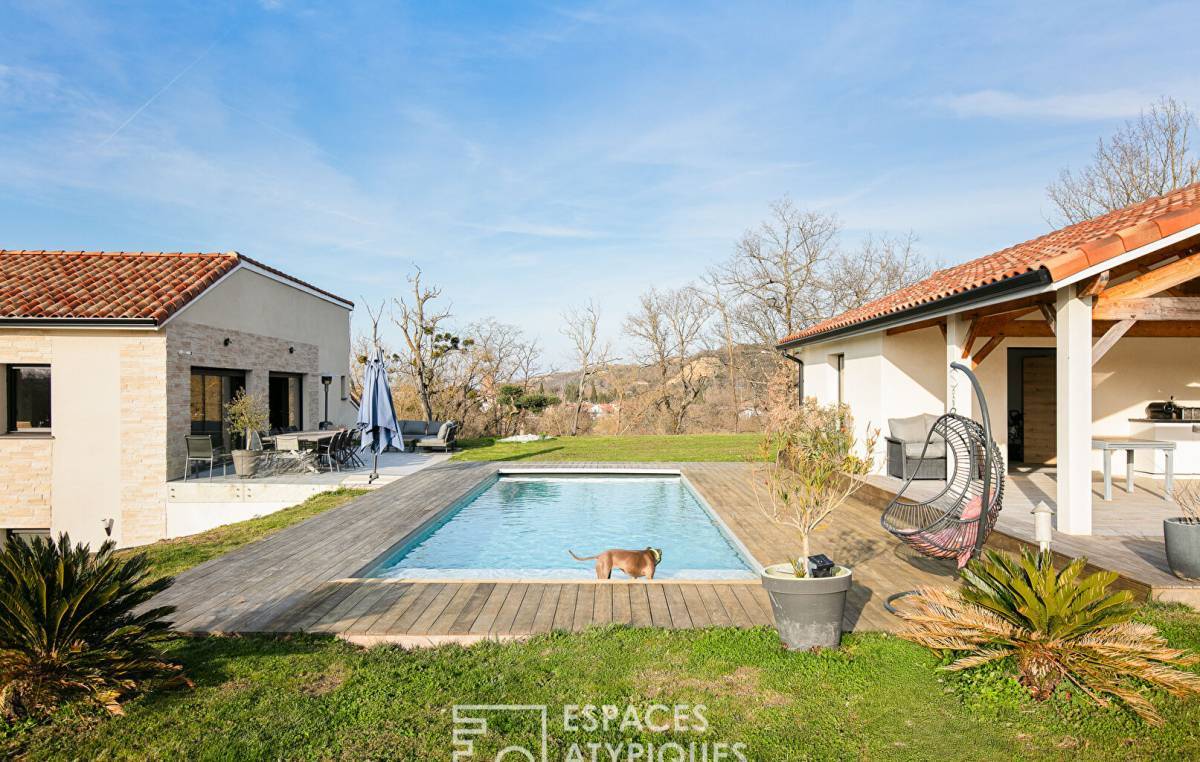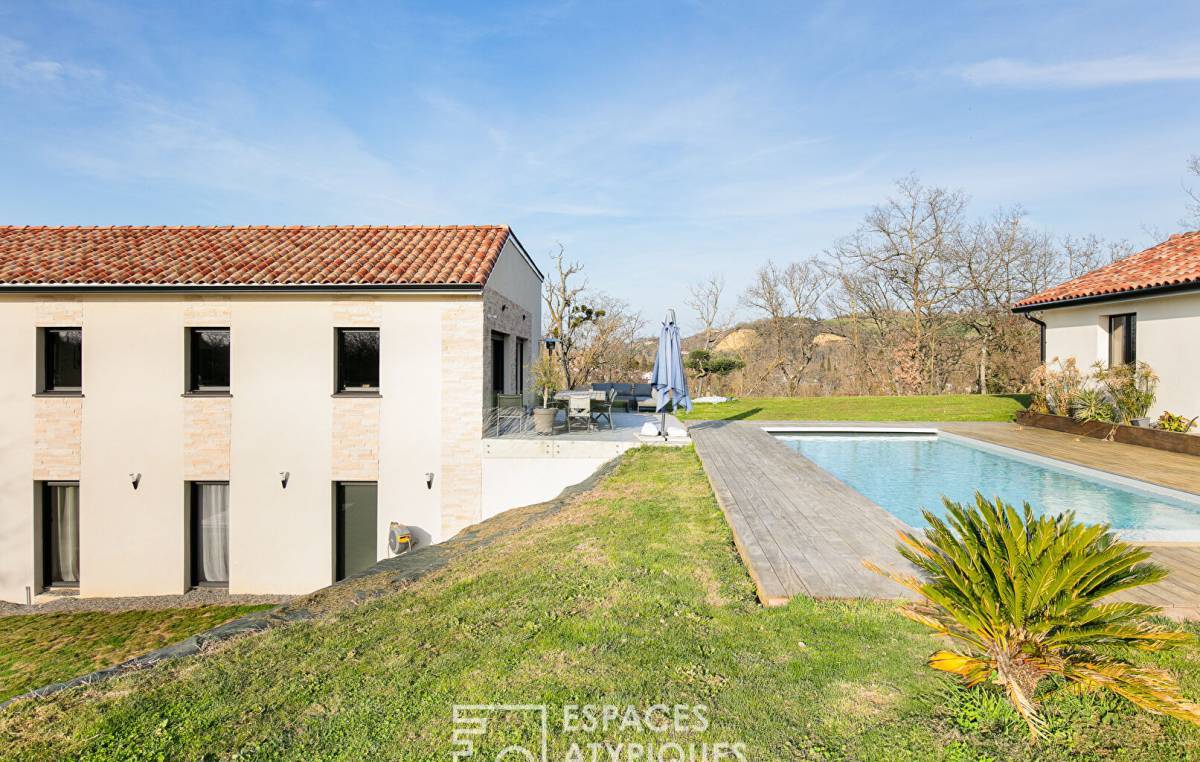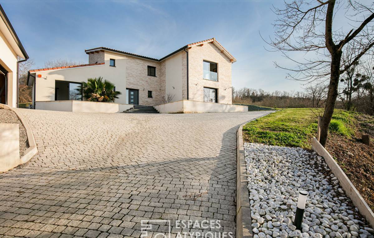 Located south of Toulouse, in Carbonne, this contemporary house from 2024 offers approximately 240sqm of living space with a swimming pool and 5-hectare park with woods. The access road gradually reveals the impressive architecture of the property. Like a hilltop house, it overlooks the surrounding countryside. Designed as an inverted duplex, the 110sqm living room offers an extraordinary volume. The living room is naturally complemented by the open kitchen. A triple exposure provides beautiful light and unobstructed views. The large windows open onto the terrace and the swimming pool. A utility room completes this level. The lower level is dedicated to relaxation. Slightly set back, a first suite with a 30sqm dressing room is located. A second suite on the other wing of the house is also available. Two final bedrooms share a bathroom with a shower and bathtub, completing this unique property. The exteriors are not to be outdone. A heated saltwater pool is surrounded by a wooden terrace and garden. A 30sqm pool house with shower and toilet also features a covered terrace. The grounds are simply sublime; a beautiful grassy area and a wooded section offer a unique view. Finally, a 90sqm garage with its 4-meter height will delight collectors or could be converted for another use, depending on the project. This property, due to its layout and the quality of its construction, constitutes a unique living space for those seeking tranquility and contemporary comfort. RT 2012 / Air-to-air and air-to-water heat pump (underfloor heating) / home automation Toulouse - Blagnac Airport 35 minutes away ENERGY CLASS: A / CLIMATE CLASS: A. Estimated average amount of annual energy expenditure for standard use, based on energy prices for the year 2023: between EUR1,030 and EUR1,460 Information on the risks to which this property is exposed is available on the Géorisques website Sales agent: Louis Chevallet - EI - RSAC number 852 573 088 - 06 47 28 38 50