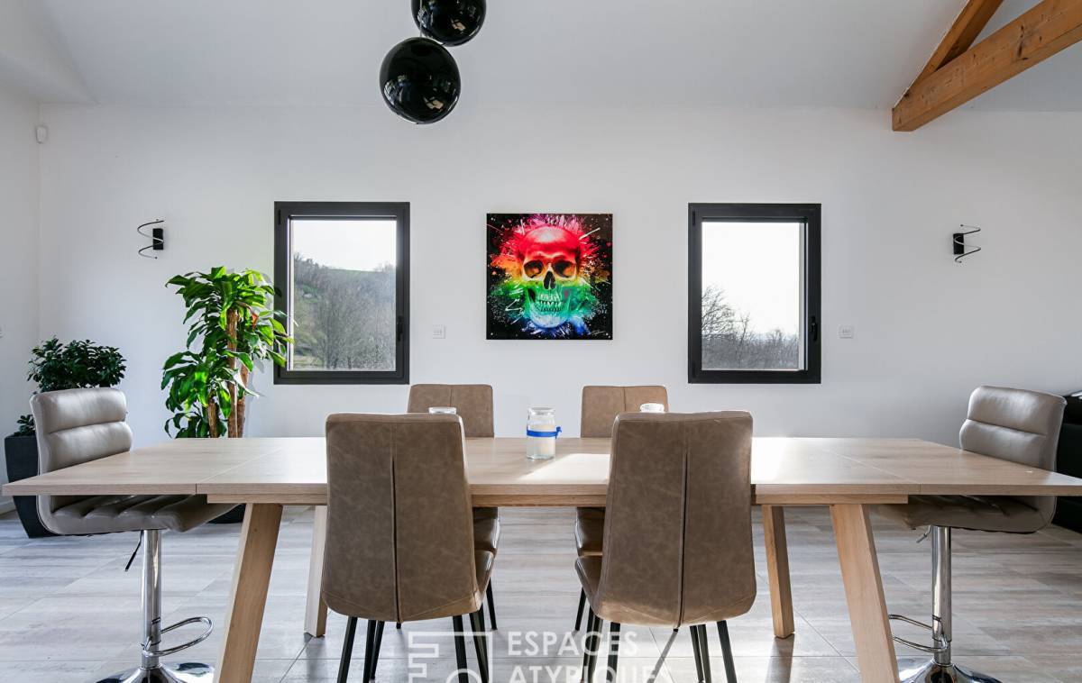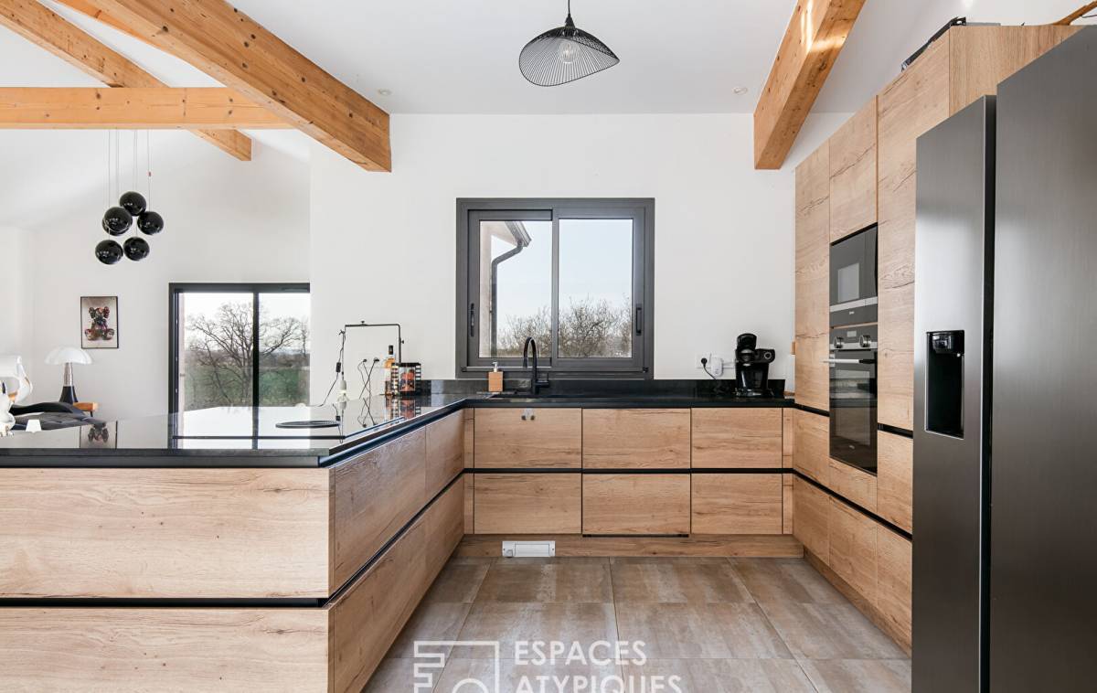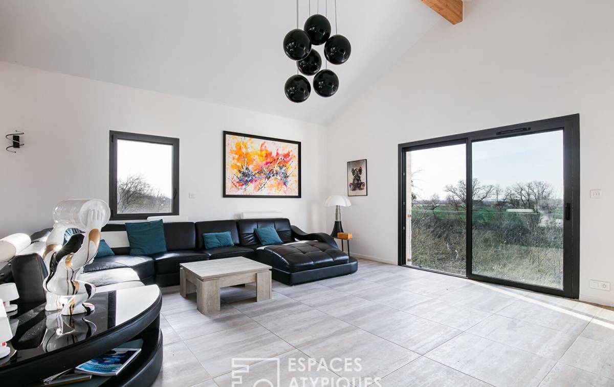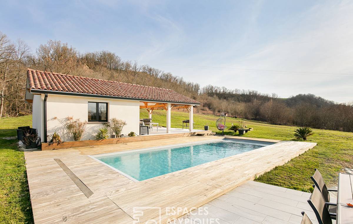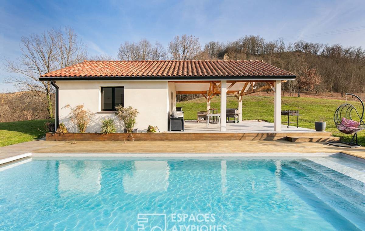 Located south of Toulouse, in Carbonne, this contemporary house from 2024 offers approximately 240sqm of living space with a swimming pool and 5-hectare park with woods. The access road gradually reveals the impressive architecture of the property. Like a hilltop house, it overlooks the surrounding countryside. Designed as an inverted duplex, the 110sqm living room offers an extraordinary volume. The living room is naturally complemented by the open kitchen. A triple exposure provides beautiful light and unobstructed views. The large windows open onto the terrace and the swimming pool. A utility room completes this level. The lower level is dedicated to relaxation. Slightly set back, a first suite with a 30sqm dressing room is located. A second suite on the other wing of the house is also available. Two final bedrooms share a bathroom with a shower and bathtub, completing this unique property. The exteriors are not to be outdone. A heated saltwater pool is surrounded by a wooden terrace and garden. A 30sqm pool house with shower and toilet also features a covered terrace. The grounds are simply sublime; a beautiful grassy area and a wooded section offer a unique view. Finally, a 90sqm garage with its 4-meter height will delight collectors or could be converted for another use, depending on the project. This property, due to its layout and the quality of its construction, constitutes a unique living space for those seeking tranquility and contemporary comfort. RT 2012 / Air-to-air and air-to-water heat pump (underfloor heating) / home automation Toulouse - Blagnac Airport 35 minutes away ENERGY CLASS: A / CLIMATE CLASS: A. Estimated average amount of annual energy expenditure for standard use, based on energy prices for the year 2023: between EUR1,030 and EUR1,460 Information on the risks to which this property is exposed is available on the Géorisques website Sales agent: Louis Chevallet - EI - RSAC number 852 573 088 - 06 47 28 38 50
