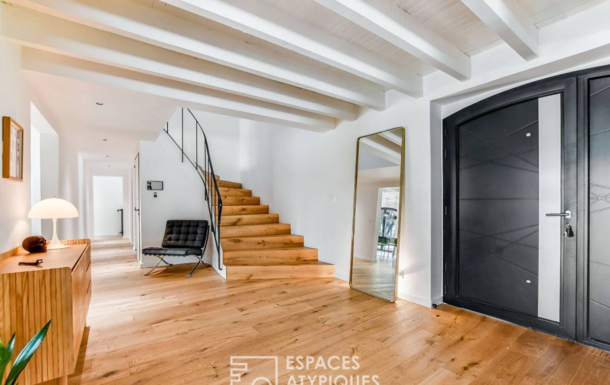A private driveway leads to the entrance of the property, reinforcing the exceptional character of the place. The ground floor reveals bright spaces with a living room, dining room, fully equipped kitchen and office, extended by direct access to the terraces. This level also has a sink and a separate WC.