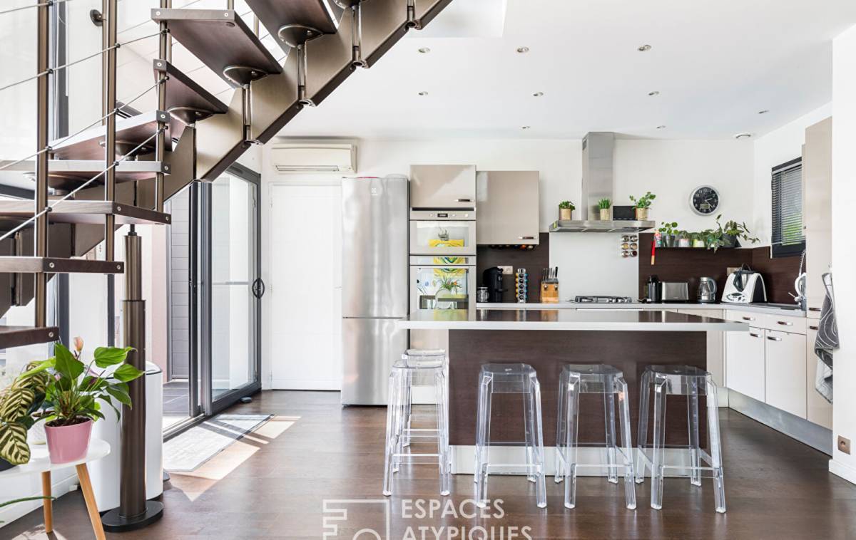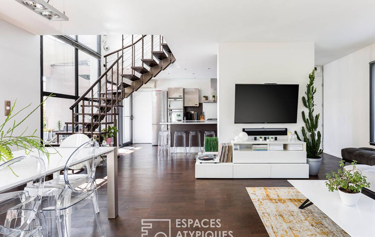 The entrance leads to a 56 sqm living space with clean lines, consisting of a living-dining room and a fully equipped open kitchen. Large bay windows allow natural light to enter every corner, accentuating the feeling of volume. The metal and wood staircase, with its resolutely industrial style, structures the space with elegance and gives a strong aesthetic signature to the whole.