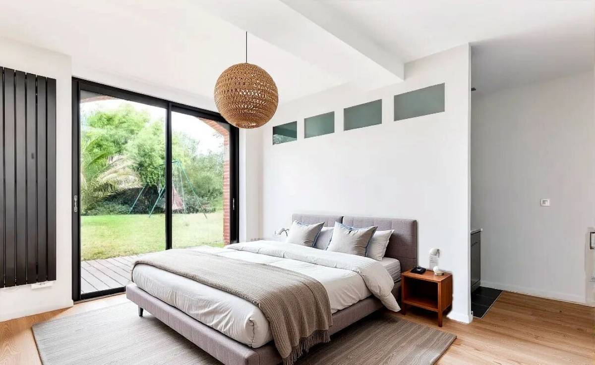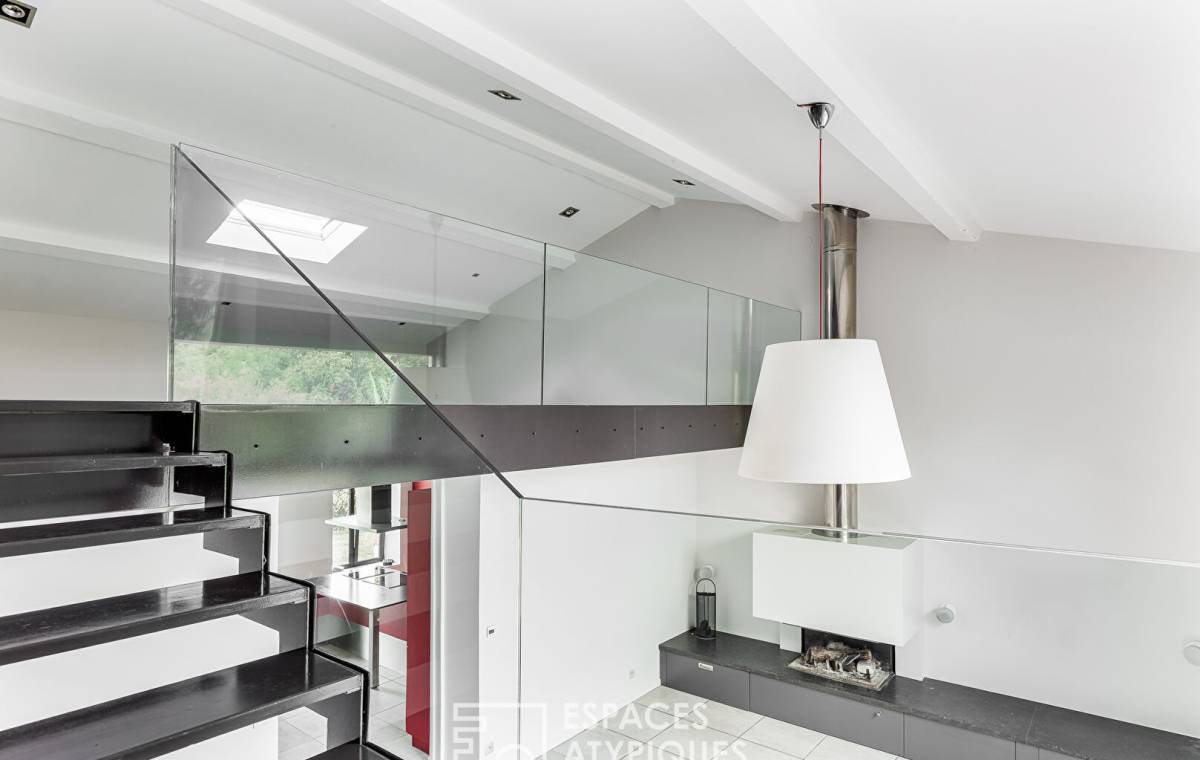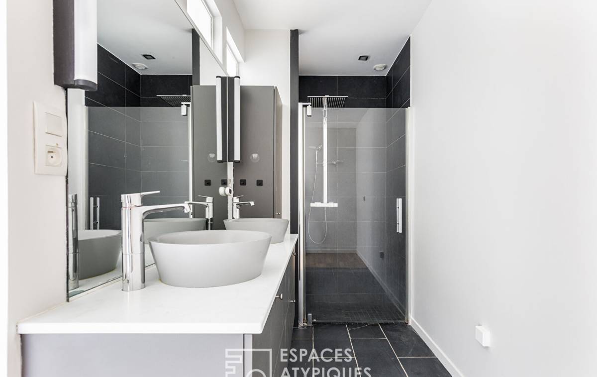 From the entrance, the volumes impress with their brightness and fluidity of circulation. The vast cathedral-style living room, bathed in light thanks to large bay windows, opens onto the terrace and garden. The clean lines, choice of materials, and play of contrasts create an atmosphere that is both warm and contemporary. The functional, open-plan kitchen is a natural extension of the living room.