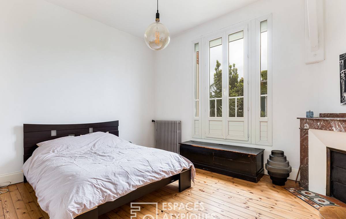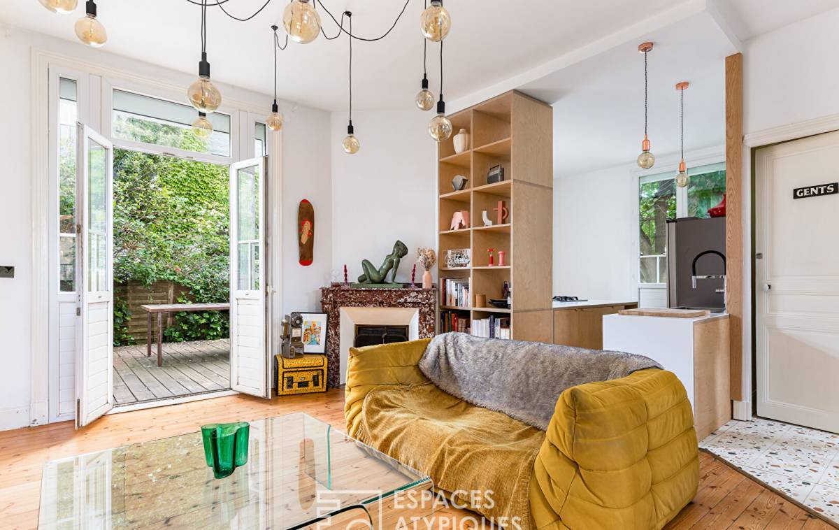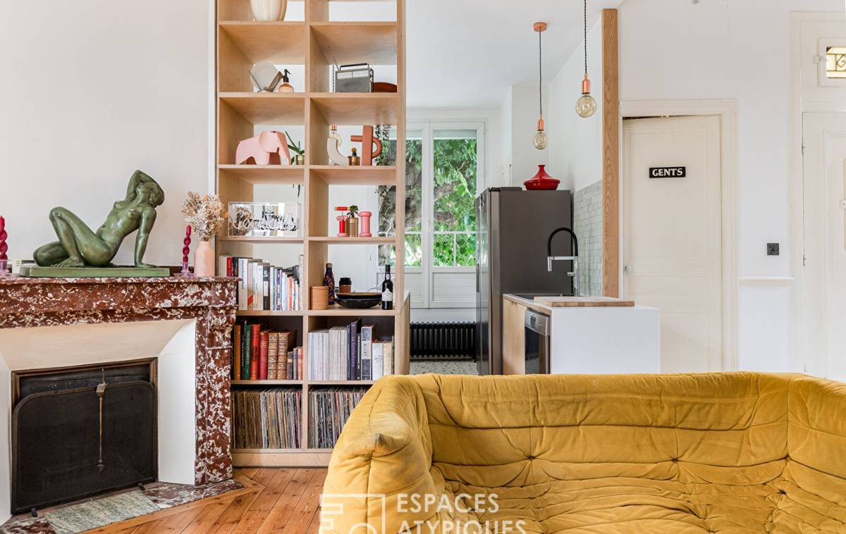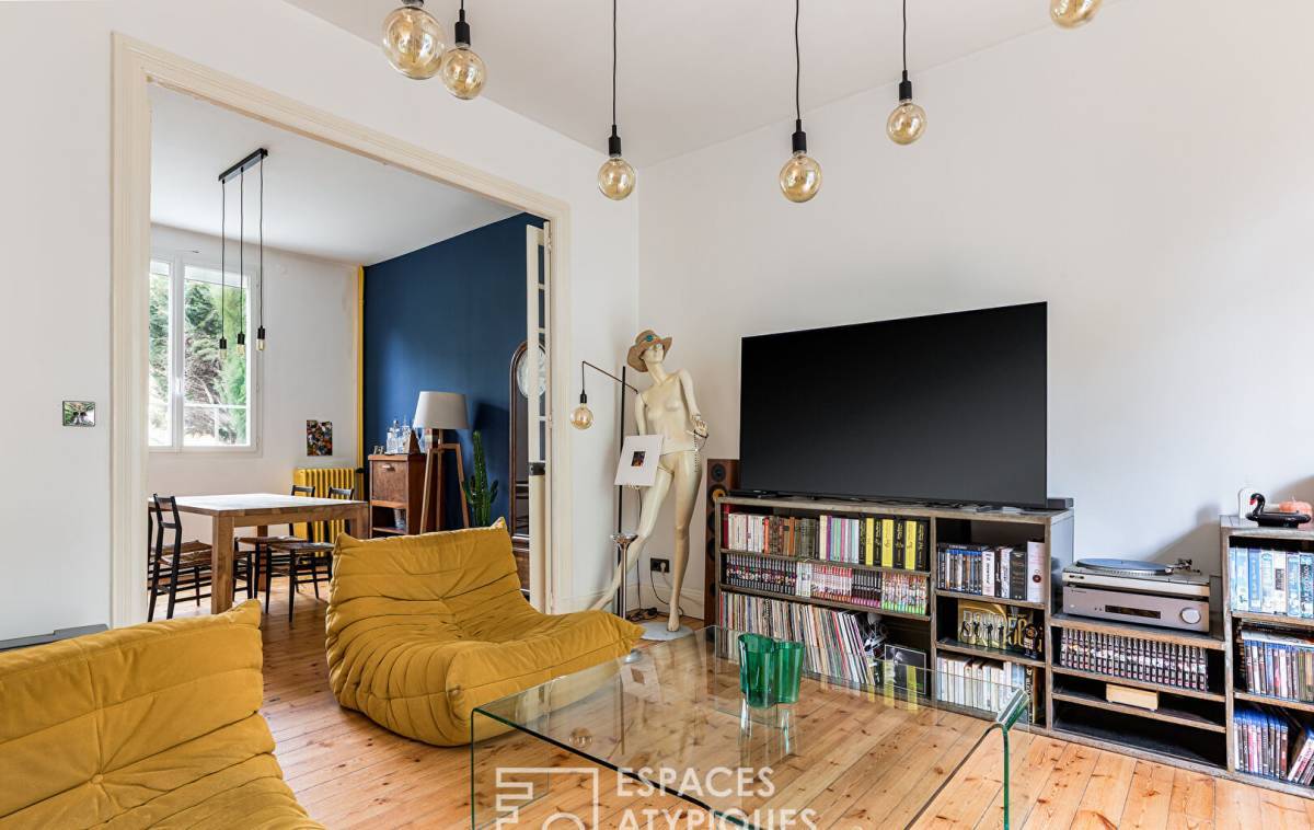 Behind the sober façade typical of Toulouse's 1930s architecture, the entrance opens onto a bright, generous living space. The living room, organized around a period fireplace and bathed in light thanks to large openings onto the garden, is structured by iconic pieces such as a Togo sofa and industrial-design pendant lighting.