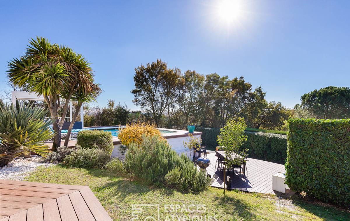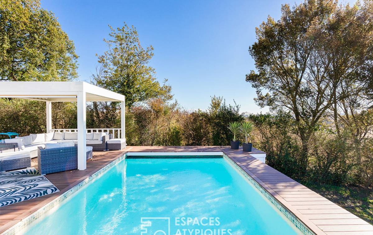 In Sainte-Foy-d'Aigrefeuille, this house of approximately 164.72 sqm, built in 1998, enjoys a peaceful and unspoiled setting with an open view over the Lauragais plains. Set on a wooded plot of 1,760 sqm, it charms with its harmonious architecture, blending traditional style with timber framing on the projecting sections. The bow window is a defining feature and floods the rooms with light. The entrance leads to a bright and inviting living room with a fireplace. Beyond this, a dining room and an open-plan kitchen, both facing the garden, encourage socializing. Two bedrooms with storage and a shower room complete the ground floor. Upstairs, there are two further bedrooms, one with an unobstructed view of the Toulouse countryside, as well as a bathroom. The basement, accessible from the kitchen, houses a laundry room and a 45 sqm garage. Outside, several terraces extend the living spaces. One borders the swimming pool, near the pétanque court, offering moments of relaxation and shared enjoyment in privacy. This bright and functional family home provides a peaceful living environment just minutes from Toulouse. Energy rating: C / Climate rating: A. Estimated average annual energy costs for standard use, based on energy prices for 2021, 2022, and 2023: between EUR1,988 and EUR2,690. Information on the risks to which this property is exposed is available on the Géorisques website: . Sales agent: Clément Lagarde - Sole Proprietorship - RSAC registration number 903 635 464 - 33 6 50 13 38 59
