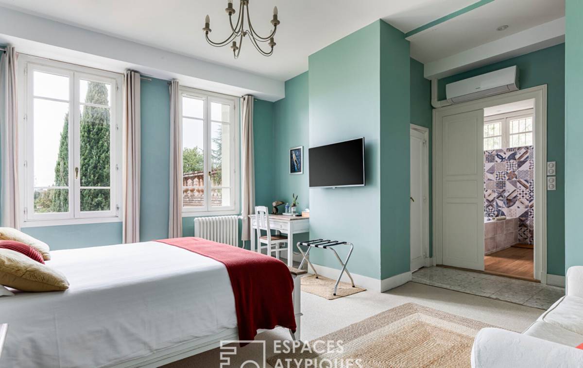 A carefully renovated independent cottage offers complete accommodation with two bedrooms, a living room, and a kitchen. The main house houses the living areas as well as four master suites, including one on the ground floor, and three other spacious bedrooms; high-end comfort, ideal for a hospitality business or a large family. Modern bathrooms complete the high-quality amenities.