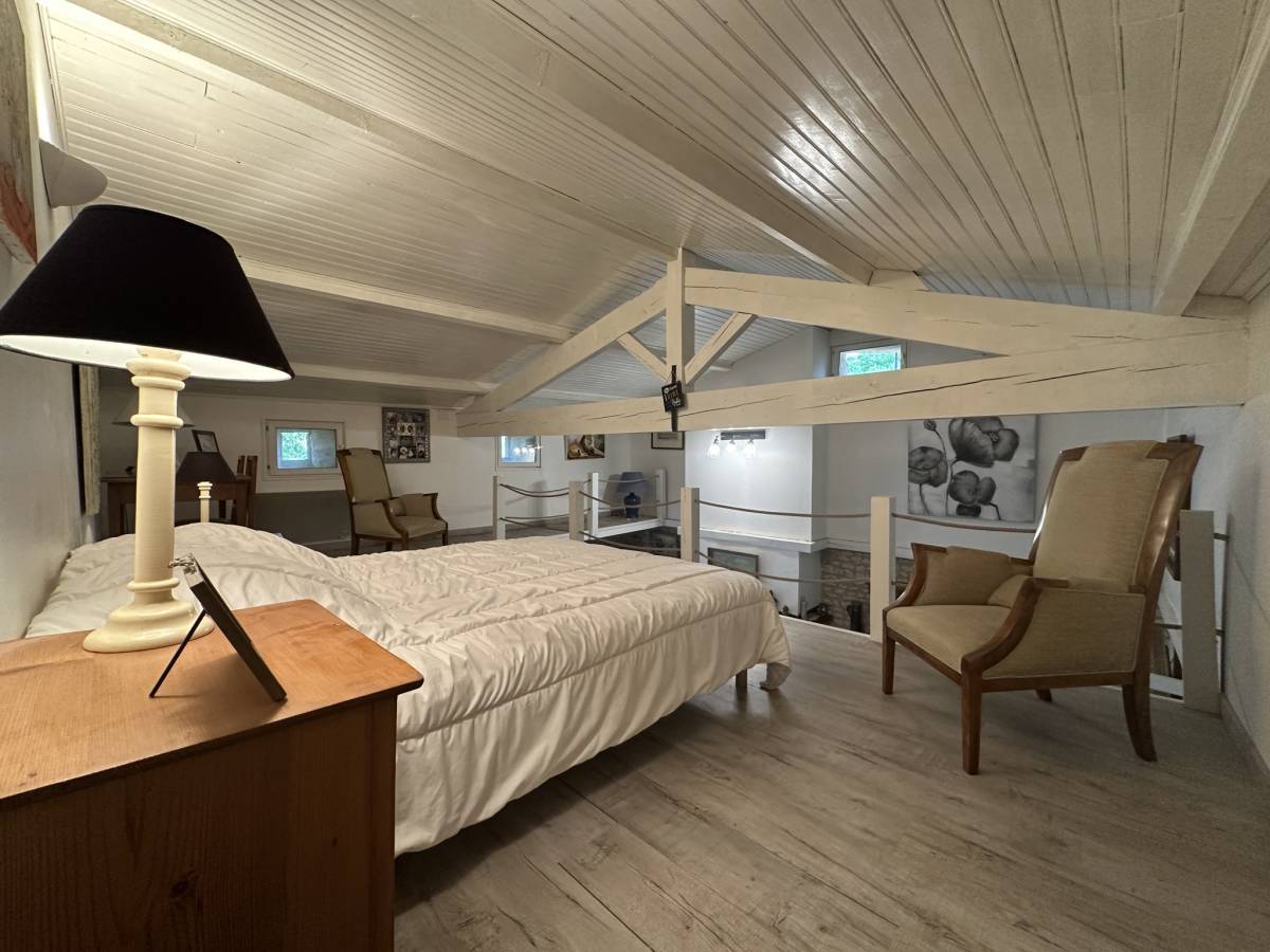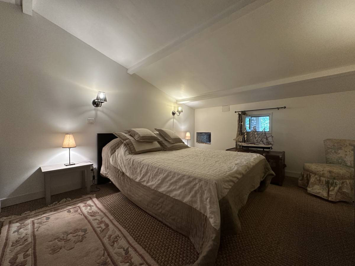The kitchen, equipped with a Lacanche range, is a true space for sharing. On the ground floor, there is a comfortable bedroom and a bathroom. Upstairs, there are two additional bedrooms and a mezzanine.