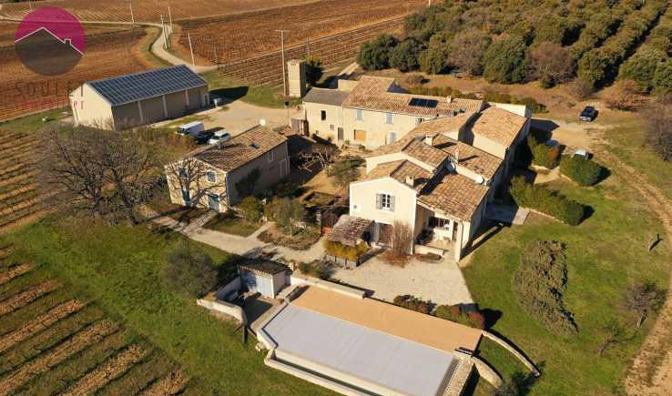 35-40 mins from Bedoin, 50 mins from Avignon. Splendid wine estate and gites of approximately 575m2 located 20 minutes from Vaison-la-Romaine. The property consists of 3 gites classified 3 stars (90, 75 and 40m2 approximately) and a main house of approximately 370m2. A 14x5 infinity pool allows you to enjoy a magnificent and unobstructed view of the surrounding landscapes. A spacious plot of 17ha including 13ha of vines overlook the estate. The main house consists of a large and bright dining room with an open kitchen of 46m2, a spacious living room of 55m2, a laundry room, a second small living room that can be used as a reading room or rest room, 5 bedrooms. Possibility of making a parental suite on the ground floor. The main property has underfloor heating. Premises to renovate 150m2. Wood pellet heating, photovoltaic panels. 432m2 of operating premises.