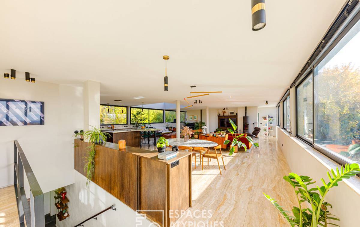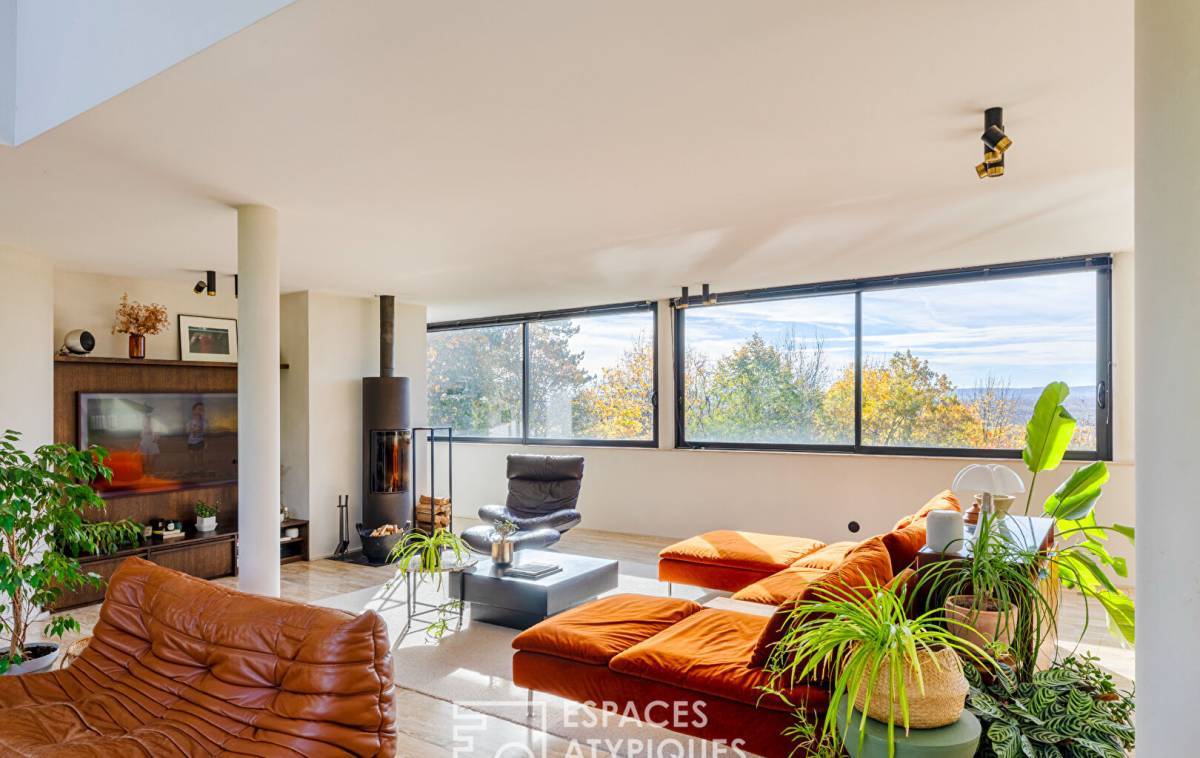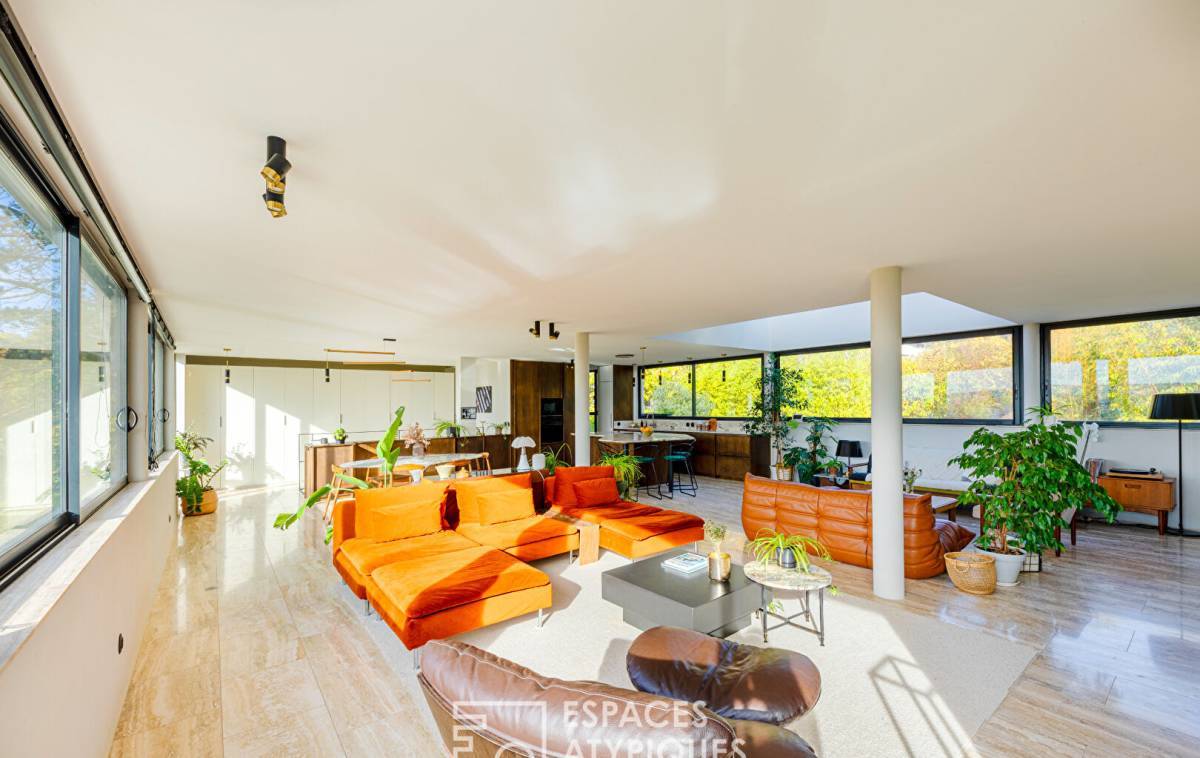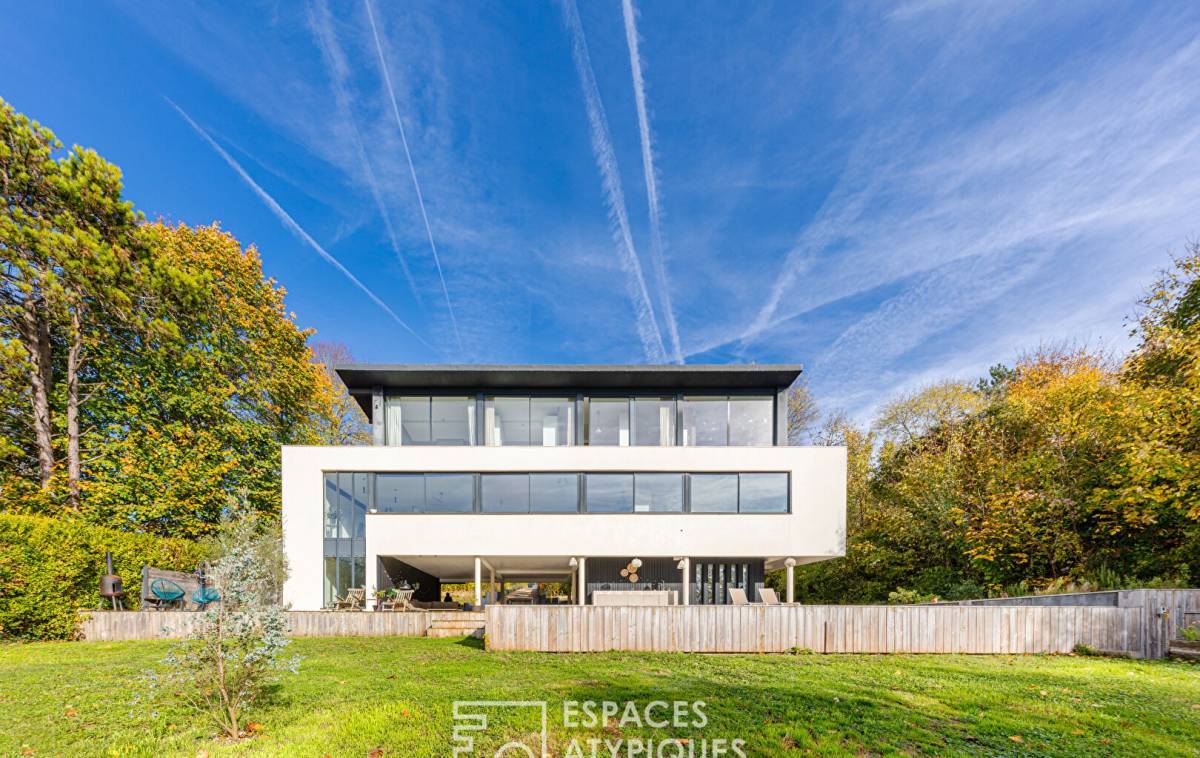 It is on the heights of Vaux-sur-Seine, on the edge of a forest, that this 265 sqm architectural creation stands. Like a modernist sentinel overlooking the valley, this villa, built in 2009 by architect Stéphane Simonin and enhanced in 2022 by an interior design firm, stands as a vibrant homage to the principles of the Villa Savoye. The airy structure seems to float above its plot thanks to a system of stilts that decouple the building from the ground, thus opening up the views. Access to the living space is via a staircase combining steel and wood. Upstairs, the open plan reveals a 112 sqm through-volume, punctuated by constant light. Ribbon windows frame the landscape and the river: the walls disappear, definitively abolishing the boundary between sky and dwelling. This space brings together two living rooms with wood-burning stoves and a welcoming eat-in kitchen, complemented by a functional pantry. The opposite wing houses two children's bedrooms (13 and 17 sq m) sharing a contemporary bathroom. The upper floor, accessed by a spiral staircase--a nod to Roger Tallon's industrial design--is dedicated to the master suite. This 52 sq m suite includes an office area, a dressing room, and a bathroom. A sanctuary of well-being, clad in terrazzo, the bathtub seems literally suspended, facing the horizon and the autumnal canopy. On the garden level, the house offers a separate space (workshop, office, or guest room) as well as the utility areas. Outdoor living takes on its full meaning here. Sheltered by stilts, a summer lounge and its outdoor kitchen extend summer evenings, facing a superb heated swimming pool surrounded by an exotic wood deck. This property achieves the rare feat of combining the serenity of living on the edge of the forest with seamless family logistics. For Parisian professionals, the luxury here lies in accessibility: Vaux-sur-Seine train station is just a 9-minute walk away (700m). Forget the stress of morning parking: a short walk is all it takes to reach line J (Paris Saint-Lazare in 40 minutes). The upcoming arrival of the RER E (Eole) at the nearby Verneuil station will further strengthen this strategic connection to La Défense. Nursery, primary, school cafeteria, and after-school care in the village will streamline daily life. Families seeking academic excellence will also find their balance thanks to Notre-Dame des Oiseaux in Verneuil. Direct connections (dedicated school bus) will foster your children's independence. As for nature: right outside the house, the Massif de l'Hautil offers its forest trails stretching as far as the eye can see. The Seine, which you can admire from the living room, becomes your playground below. The landscaped banks invite you to enjoy bucolic walks along the towpath, jogs by the water, or bike rides far from the hustle and bustle of the city. And for everyday needs, the village center with its essential shops (bakeries, grocery store, pharmacy, tobacconist, and medical center) makes daily life easier, complemented by the vibrant commercial activity of Meulan, Verneuil, and Orgeval, just a few minutes away. Energy rating: C | Climate rating: A. Estimated average annual energy costs for standard use, based on 2021 energy prices: between EUR3,080 and EUR4,220. Julie - 33 7 77 84 74 57