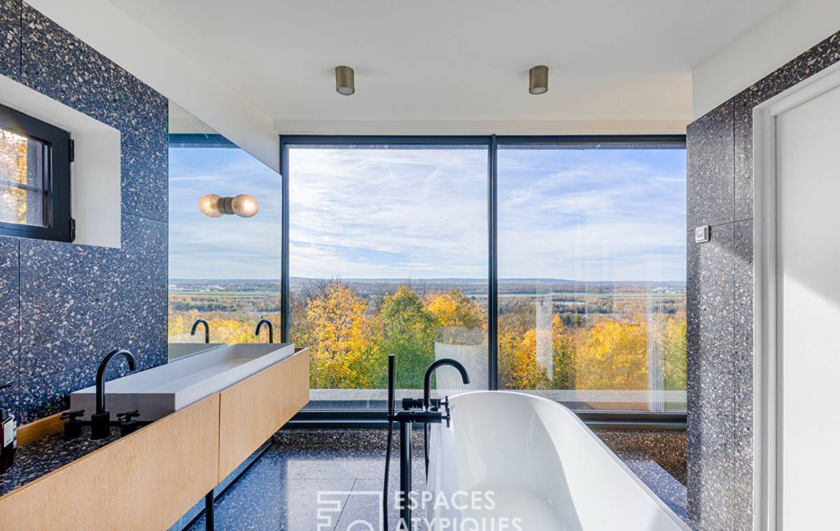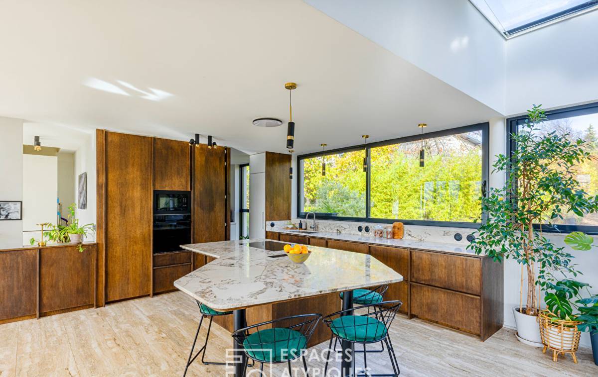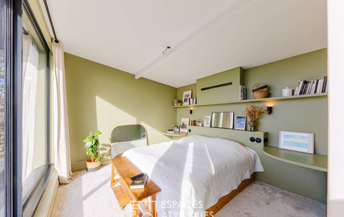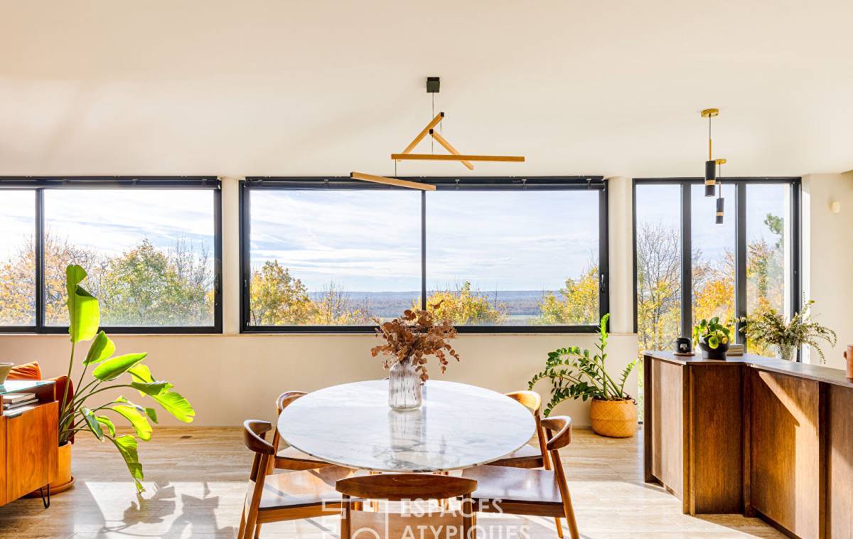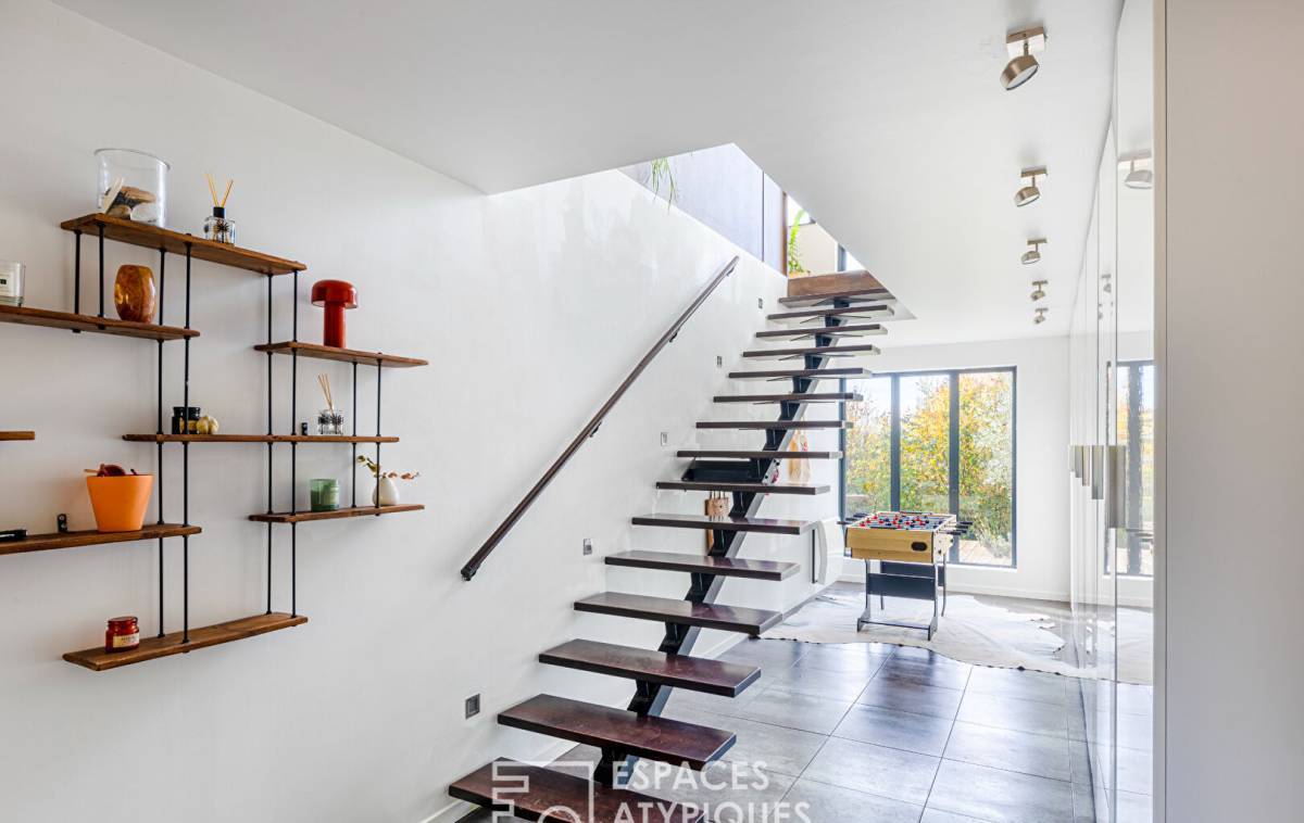 It is on the heights of Vaux-sur-Seine, on the edge of a forest, that this 265 sqm architectural creation stands. Like a modernist sentinel overlooking the valley, this villa, built in 2009 by architect Stéphane Simonin and enhanced in 2022 by an interior design firm, stands as a vibrant homage to the principles of the Villa Savoye. The airy structure seems to float above its plot thanks to a system of stilts that decouple the building from the ground, thus opening up the views. Access to the living space is via a staircase combining steel and wood. Upstairs, the open plan reveals a 112 sqm through-volume, punctuated by constant light. Ribbon windows frame the landscape and the river: the walls disappear, definitively abolishing the boundary between sky and dwelling. This space brings together two living rooms with wood-burning stoves and a welcoming eat-in kitchen, complemented by a functional pantry. The opposite wing houses two children's bedrooms (13 and 17 sq m) sharing a contemporary bathroom. The upper floor, accessed by a spiral staircase--a nod to Roger Tallon's industrial design--is dedicated to the master suite. This 52 sq m suite includes an office area, a dressing room, and a bathroom. A sanctuary of well-being, clad in terrazzo, the bathtub seems literally suspended, facing the horizon and the autumnal canopy. On the garden level, the house offers a separate space (workshop, office, or guest room) as well as the utility areas. Outdoor living takes on its full meaning here. Sheltered by stilts, a summer lounge and its outdoor kitchen extend summer evenings, facing a superb heated swimming pool surrounded by an exotic wood deck. This property achieves the rare feat of combining the serenity of living on the edge of the forest with seamless family logistics. For Parisian professionals, the luxury here lies in accessibility: Vaux-sur-Seine train station is just a 9-minute walk away (700m). Forget the stress of morning parking: a short walk is all it takes to reach line J (Paris Saint-Lazare in 40 minutes). The upcoming arrival of the RER E (Eole) at the nearby Verneuil station will further strengthen this strategic connection to La Défense. Nursery, primary, school cafeteria, and after-school care in the village will streamline daily life. Families seeking academic excellence will also find their balance thanks to Notre-Dame des Oiseaux in Verneuil. Direct connections (dedicated school bus) will foster your children's independence. As for nature: right outside the house, the Massif de l'Hautil offers its forest trails stretching as far as the eye can see. The Seine, which you can admire from the living room, becomes your playground below. The landscaped banks invite you to enjoy bucolic walks along the towpath, jogs by the water, or bike rides far from the hustle and bustle of the city. And for everyday needs, the village center with its essential shops (bakeries, grocery store, pharmacy, tobacconist, and medical center) makes daily life easier, complemented by the vibrant commercial activity of Meulan, Verneuil, and Orgeval, just a few minutes away. Energy rating: C | Climate rating: A. Estimated average annual energy costs for standard use, based on 2021 energy prices: between EUR3,080 and EUR4,220. Julie - 33 7 77 84 74 57