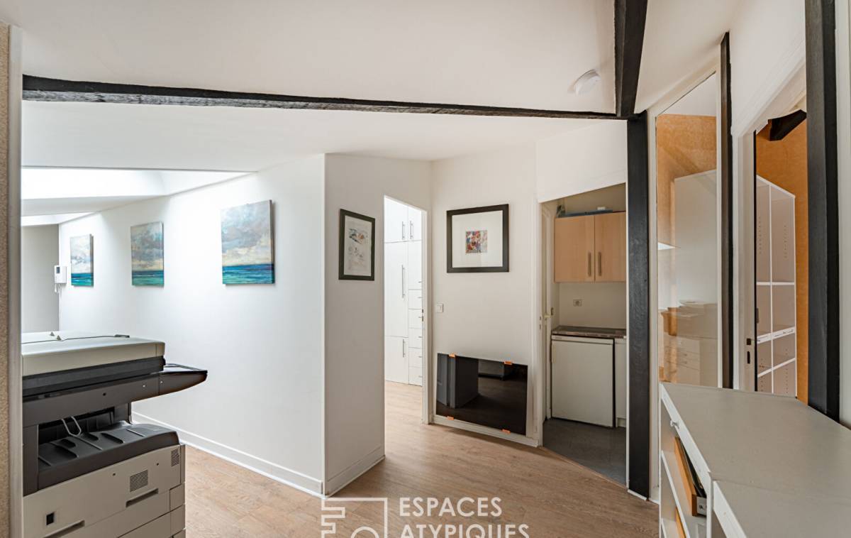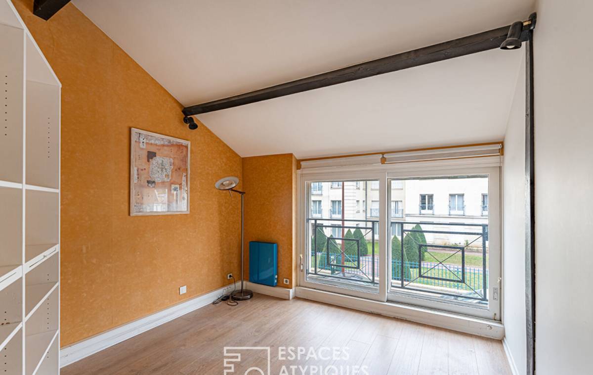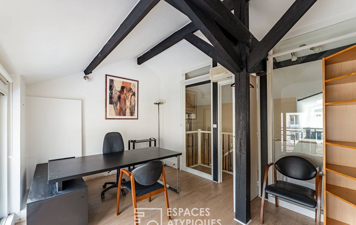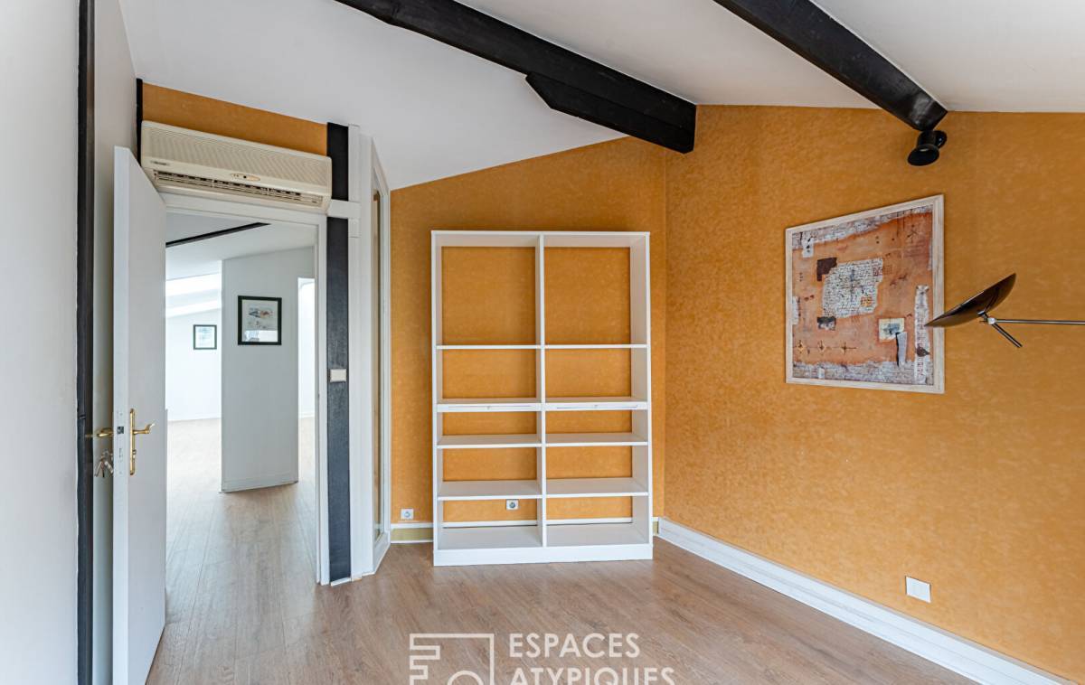 Upstairs, a large floor space, divided by partitions, offers complete freedom of layout. Here, anything is possible: a family home with 3 or 4 rooms, a loft with 1 or 2 bedrooms, an atypical living space where light and circulation become the central theme, a custom interior designed according to the wishes of its future owner.