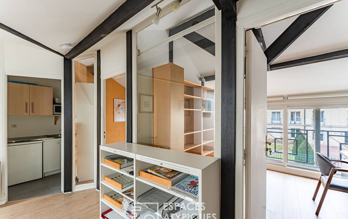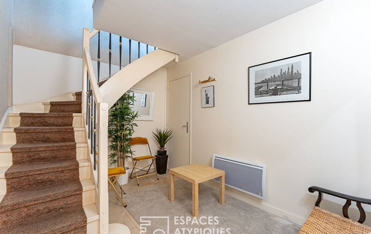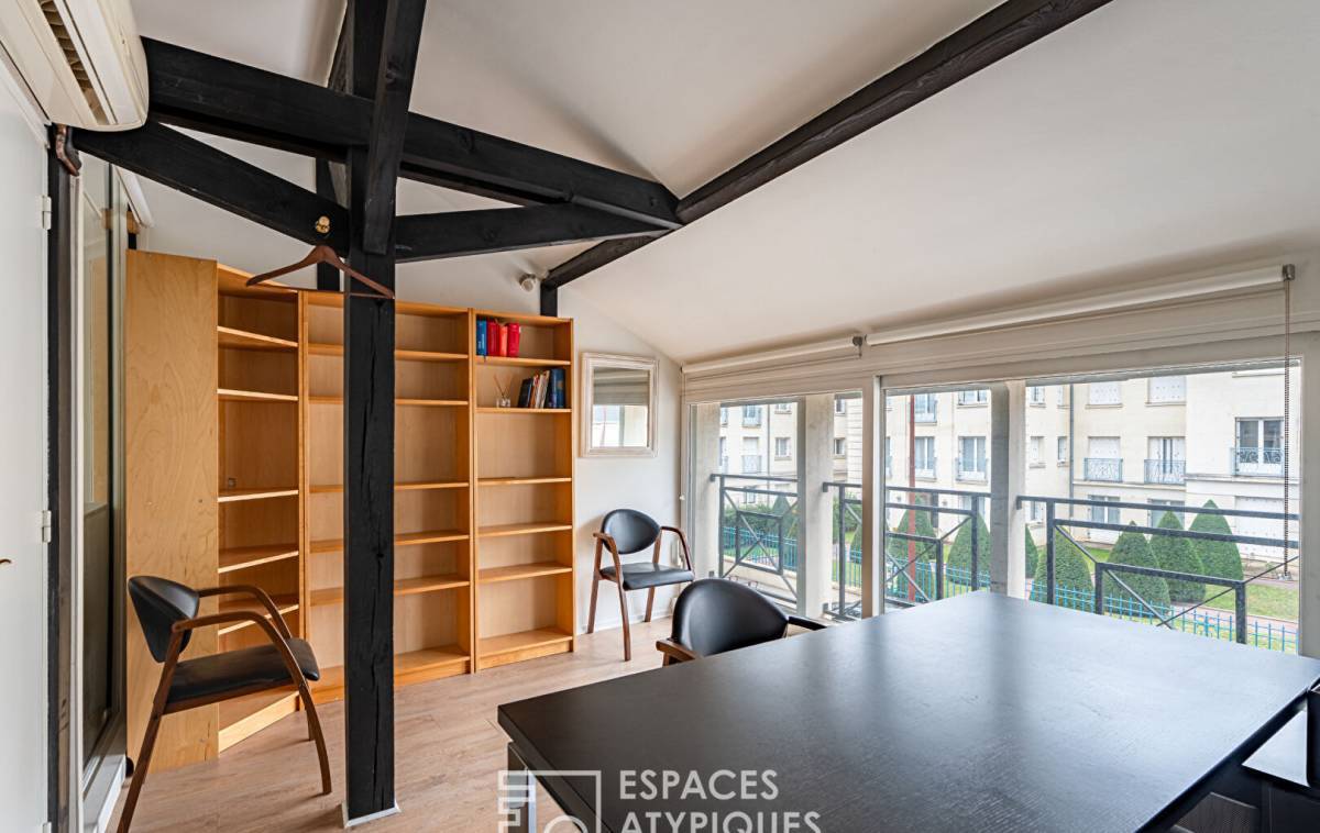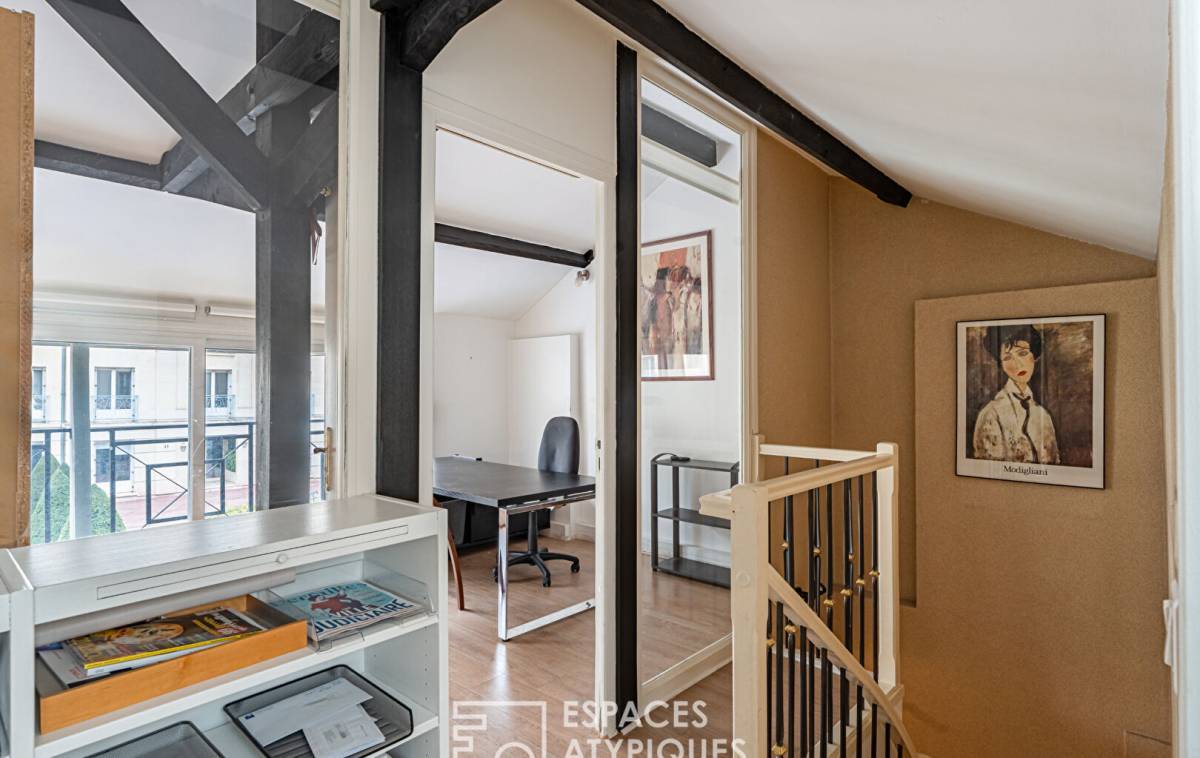 Upstairs, a large floor space, divided by partitions, offers complete freedom of layout. Here, anything is possible: a family home with 3 or 4 rooms, a loft with 1 or 2 bedrooms, an atypical living space where light and circulation become the central theme, a custom interior designed according to the wishes of its future owner.