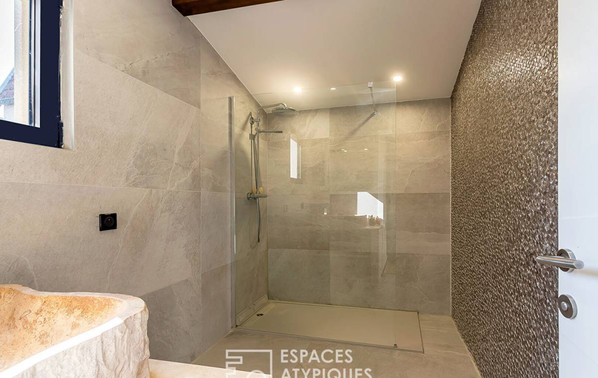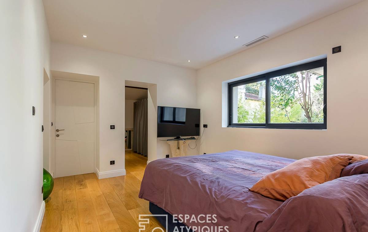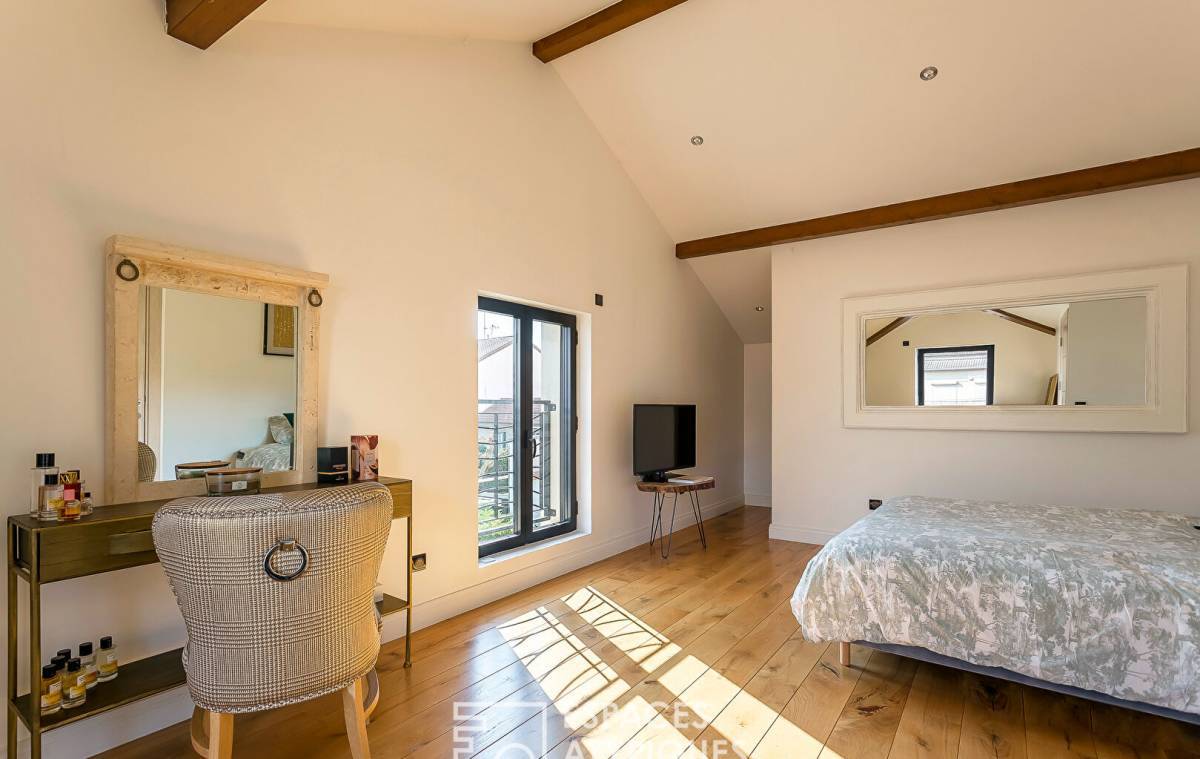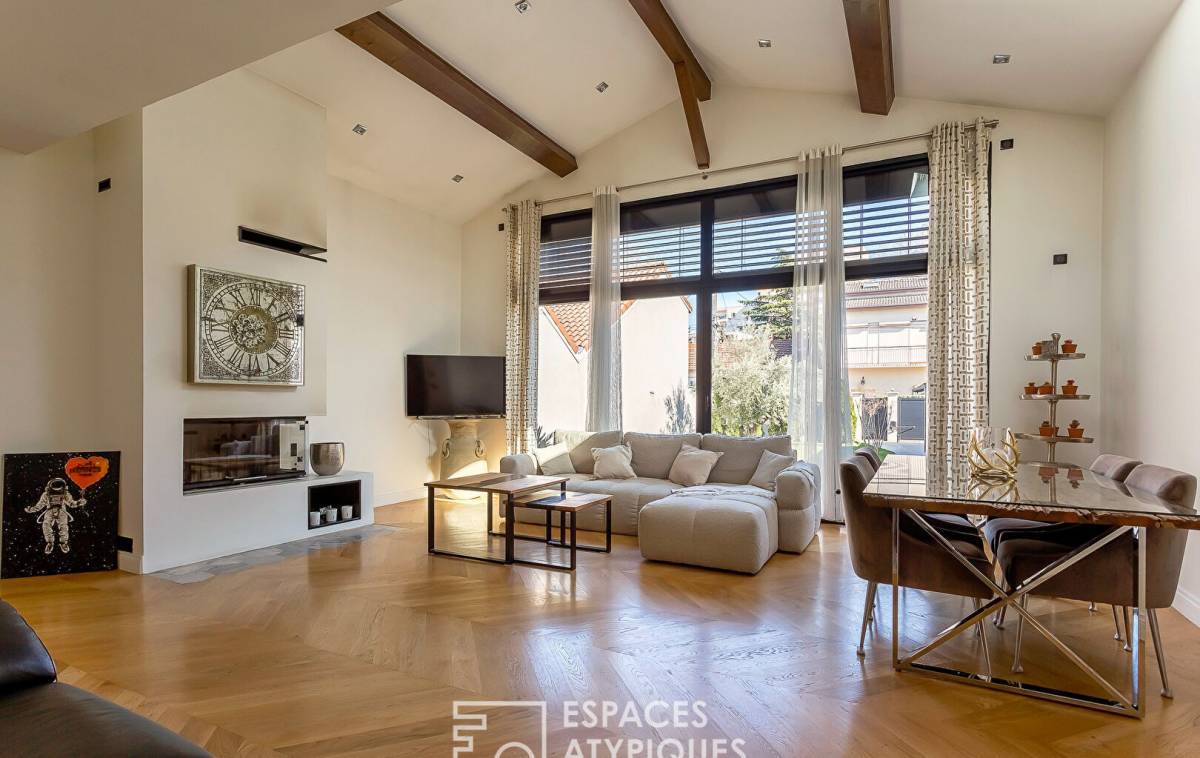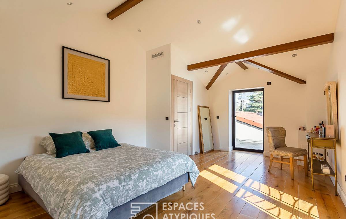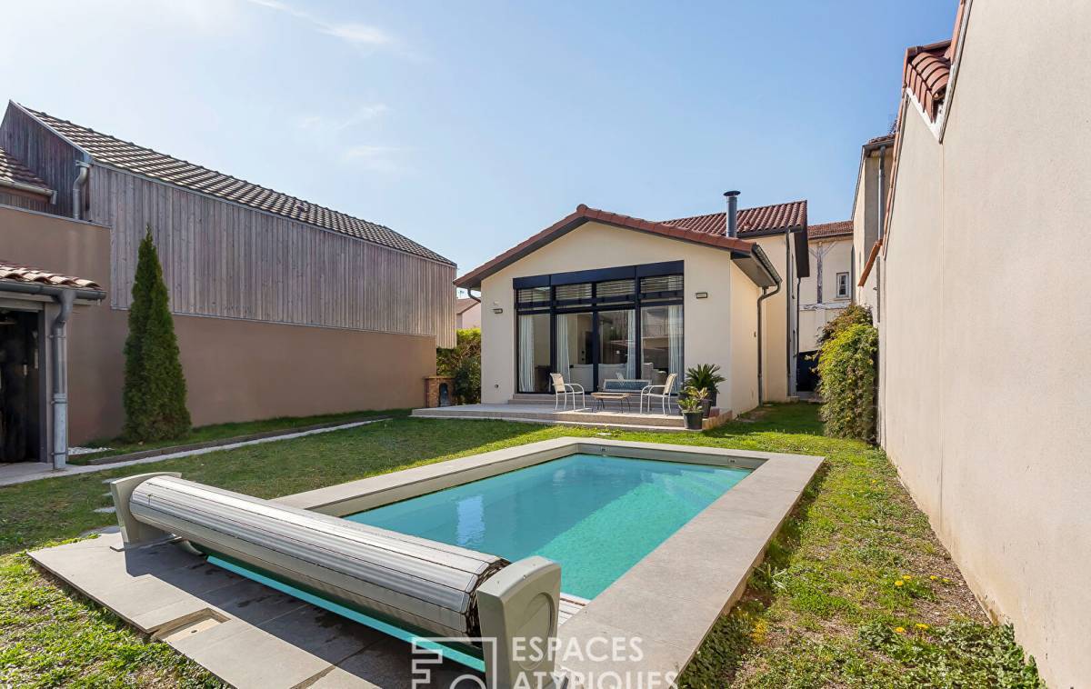 In the heart of Villeurbanne, in a peaceful cul-de-sac, sheltered from the hustle and bustle of the city and a stone's throw from the Cusset metro station, this contemporary house of 140sqm (184sqm on the ground) sits on a plot of 484sqm. It offers a pleasant living environment, combining character and modernity. Spread over two levels, it offers generous volumes and quality fittings, all enhanced by a beautiful garden with a swimming pool. Upon entering, the ground floor reveals a living room enhanced by a 4.5m high cathedral ceiling and herringbone parquet flooring that reinforces the warm character of the room. The fireplace adds a touch of authenticity, while the large openings let in beautiful natural light. A separate, high-end, modern and functional kitchen opens onto a terrace ideal for outdoor dining. A master suite with a dressing room and private bathroom completes this level, offering an intimate and comfortable space. A toilet is added to this layout. The upper floor houses two large bedrooms with parquet flooring, one of which has a dressing room and private access to a terrace. A shower room and a toilet complete this sleeping area. Taking place in the basement of this astonishing renovation, a storeroom and a space converted into a studio. Characterized by its unexpected volumes, its unstructured spaces and its exceptional materials, this house was created and designed with taste. The various outdoor spaces and the modernity of the place are the undeniable assets of this family refuge. A rare property, where charm and comfort meet with elegance. - Closed fireplace - Air conditioning - BSO electric Venetian blinds in the living room - Armored entrance door - Electric gate - Pool house ENERGY CLASS: C / CLIMATE CLASS: C