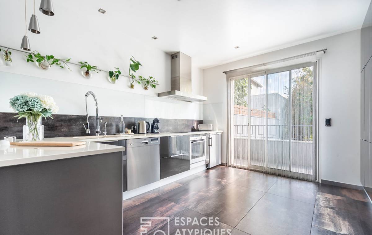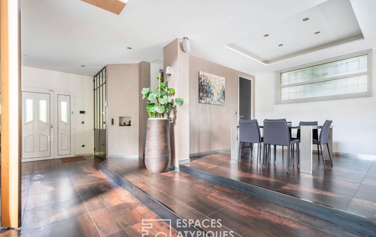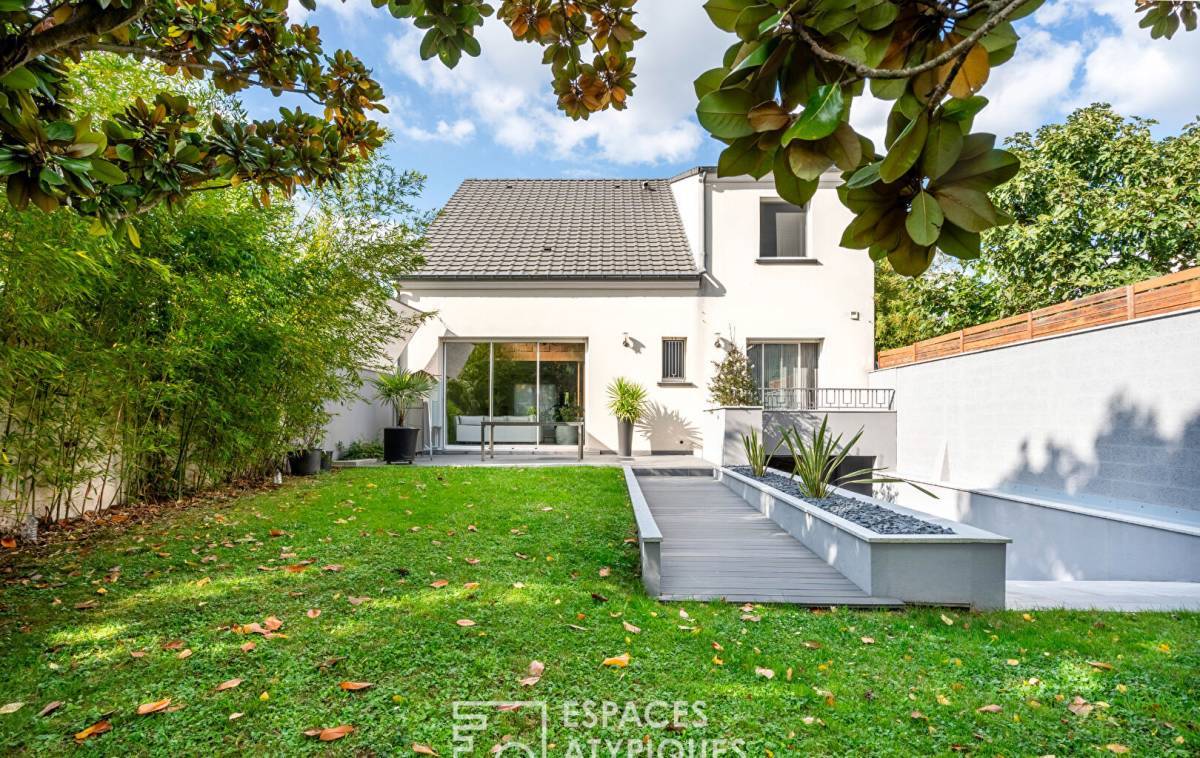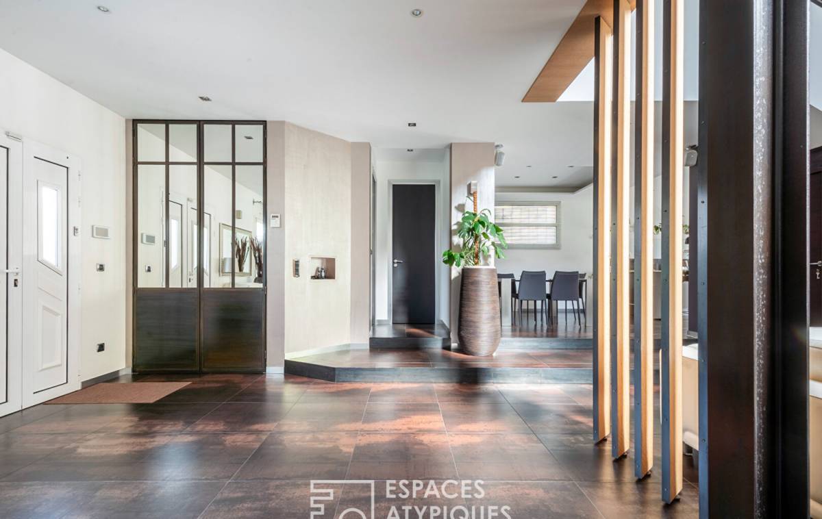 At the end of a private driveway, this architect-designed house with 2,040 square feet of living space and 3,250 square feet of floor space is nestled in a peaceful, green setting, surrounded by granite, palm trees and a Mediterranean atmosphere. Here, you immediately feel like you are somewhere else, even though you are in Vitry-sur-Seine, on the plateau, a few steps from Villejuif.