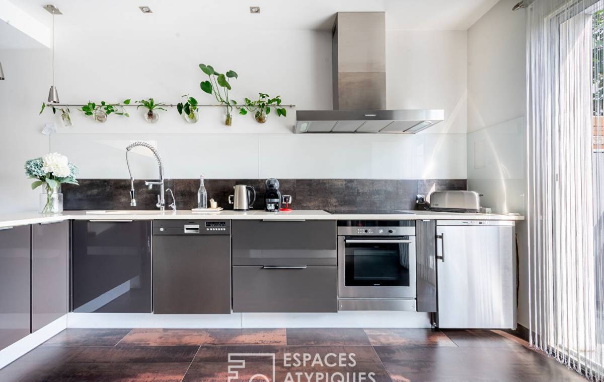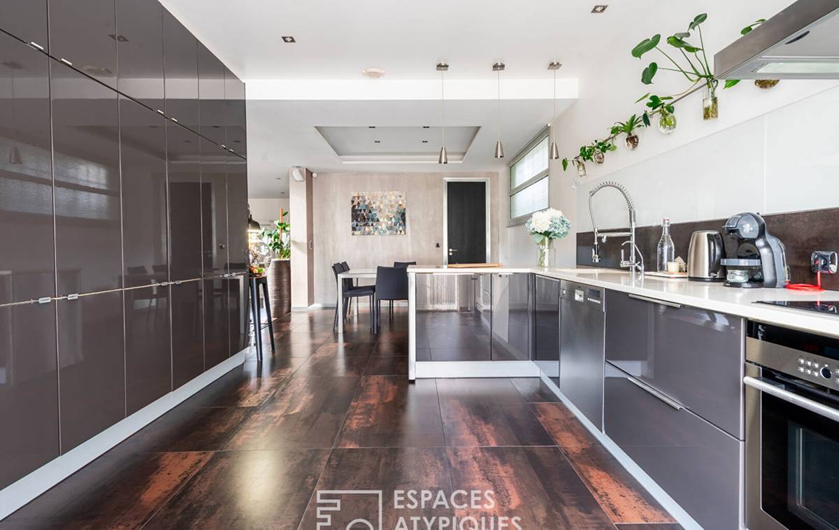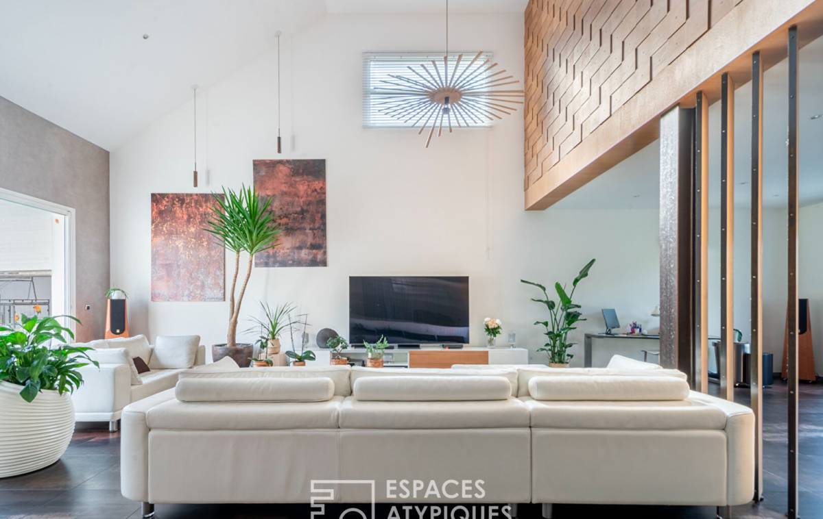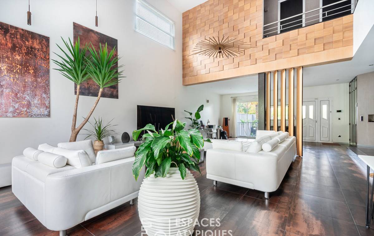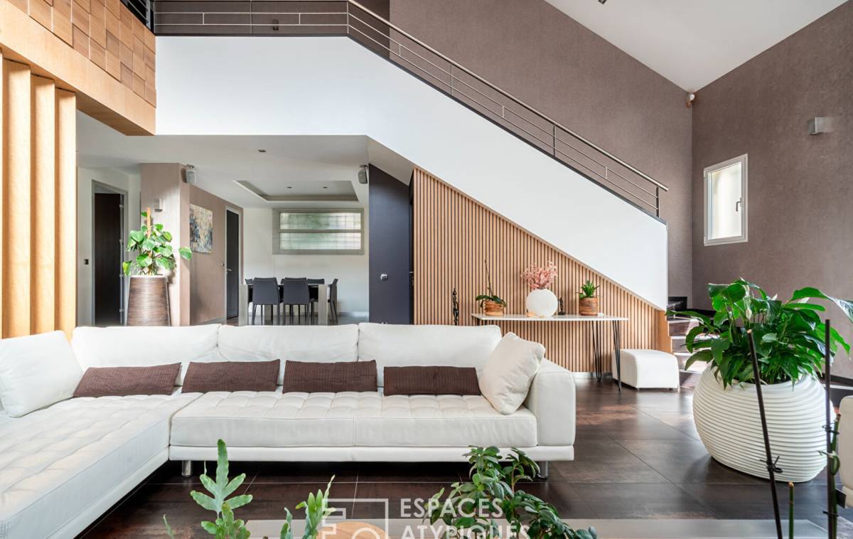 At the end of a private driveway, this architect-designed house with 2,040 square feet of living space and 3,250 square feet of floor space is nestled in a peaceful, green setting, surrounded by granite, palm trees and a Mediterranean atmosphere. Here, you immediately feel like you are somewhere else, even though you are in Vitry-sur-Seine, on the plateau, a few steps from Villejuif.